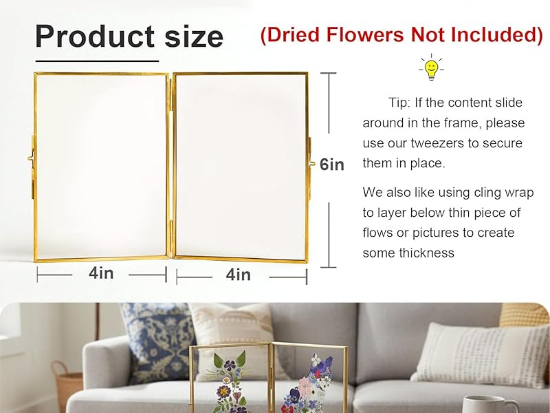 Twin Picture Brass Standing Frame: Our elegant 4x6 gold metal frame use layered design to create a beautiful see-through effect, perfect for displaying both photos and pressed flowers. It supports floating displays for smaller photos (2x3", 2.5x3.5", 3x4", 3.5x4.5", 3x5") and a full 4x6" display without the floating effect. A timeless, sophisticated addition to any space