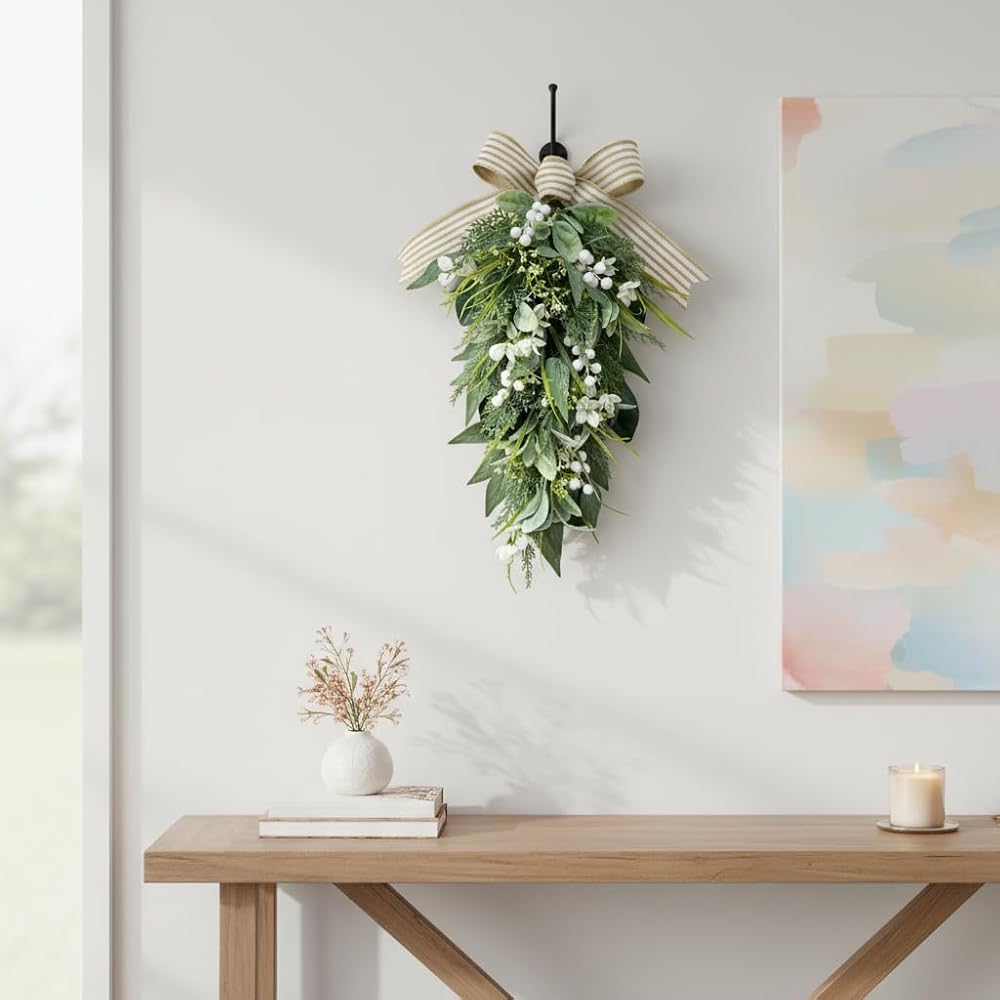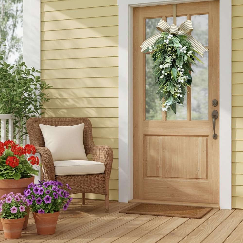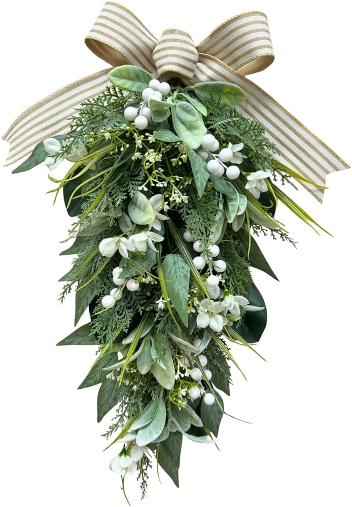 ELEGANT FARMHOUSE WELCOME: Grace your home with the timeless charm of this beautiful teardrop swag. Artfully designed with a lush blend of realistic eucalyptus, soft lamb's ear, delicate white florals, and crisp white berries, it creates a full and inviting look. The elegant beige and white striped farmhouse bow adds the perfect finishing touch, making it a stunning accent for your front door, entryway, or any wall