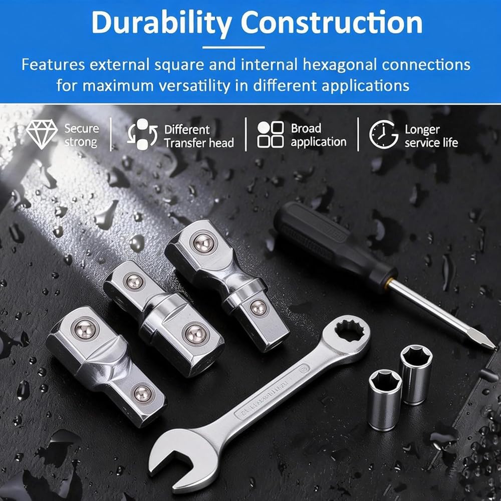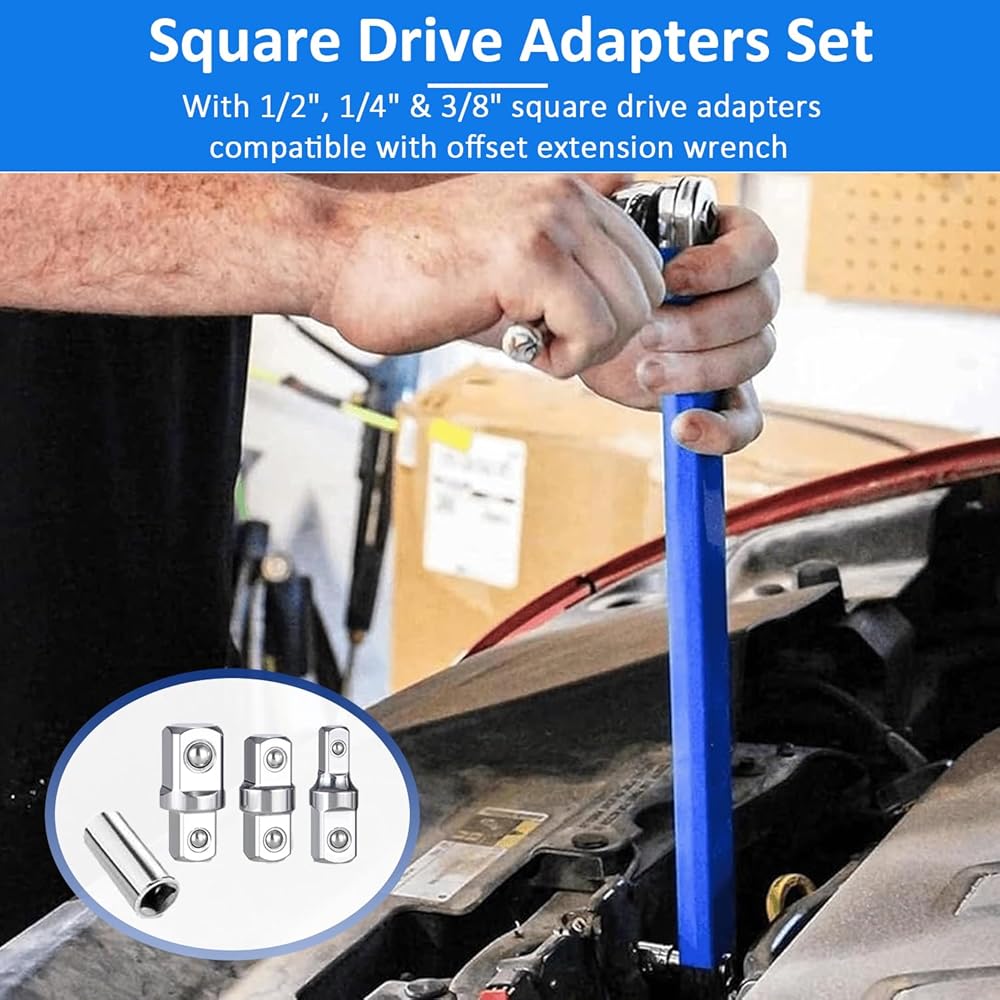 【 Versatile Compatibility 】- These ratcheting wrench to square drive adapters seamlessly fit all hexagonal side handles with 4 square hole grooves. When working on water pumps, power steering pumps, generators, air conditioning compressors, gearboxes, starters, etc., you will be able to reach hard to reach fasteners with the help of the tool