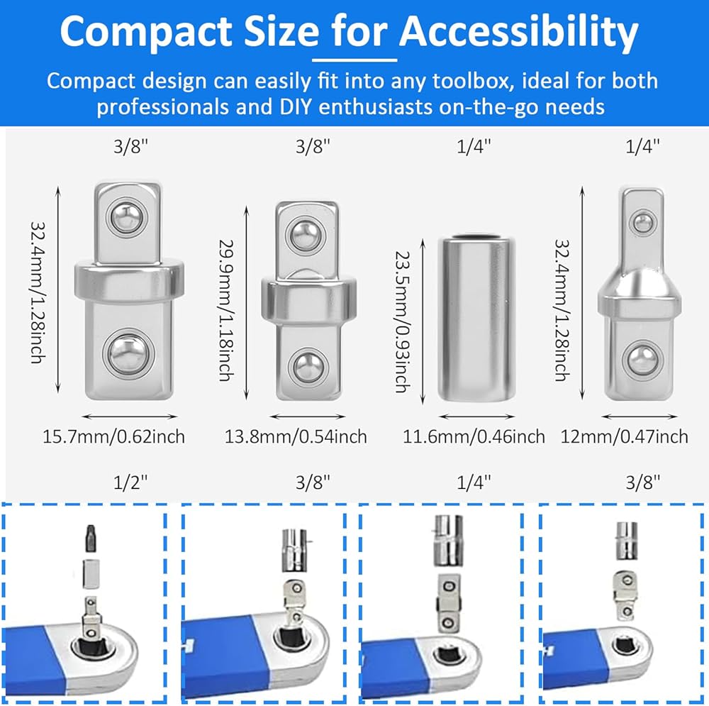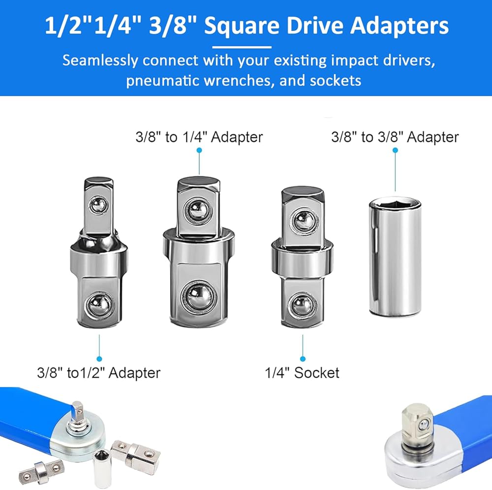 【 Effortless Adapter Switching 】- This set includes 1/2", 1/4", 3/8" square drive adapters and 1/4 square to 1/4 hex adapter drive bit, providing the flexibility to transition between different tools seamlessly. tackle any project with precision, from electric wrenches to hand drills.