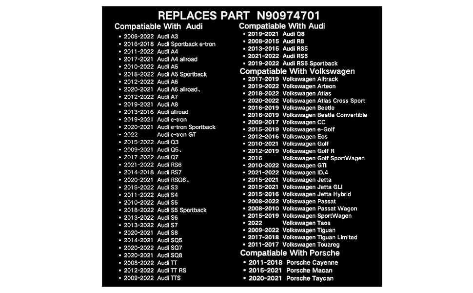 Applicable Vehicle Models:Compatiable With 2017-2019 VW Alltrack / 2019-2022 VW Arteon / 2018-2022 VW Atlas / 2020-2022 VW Atlas Cross Sport / 2016-2019 VW Beetle / 2016-2019 VW Beetle Convertible / 2009-2017 VW Cc / 2015-2019 VW e-Golf / 2012-2016 VW Eos / 2010-2021 VW GoIf / 2012-2013 VW GoIf R / 2015-2019 VW GoIf R / 2016 VW Golf SportWagen / 2010-2022 VW GTI / 2021-2022 VW ID.4 / 2015-2021 VW Jetta / 2015-2021 VW Jetta GLl / 2015-2016 VW Jetta Hybrid / 2008-2010 VW Passat / 2012-2022 VW Passat / 2008-2010 VW Passat Wagon / 2015-2019 VW Sport Wagen / 2022 VW Taos / 2009-2022 VW Tiguan / 2017-2018 Vw Tiguan Limited / 2011-2017 VW Touareg