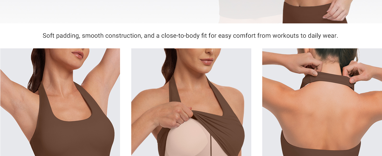 NO-CHAFE FINISH, STAY-PUT FEEL: Flat seams and a tag-free neckline reduce rubbing, while a soft halter strap spreads pressure. Elastic hem resists rolling for comfort from class to travel and lounge.