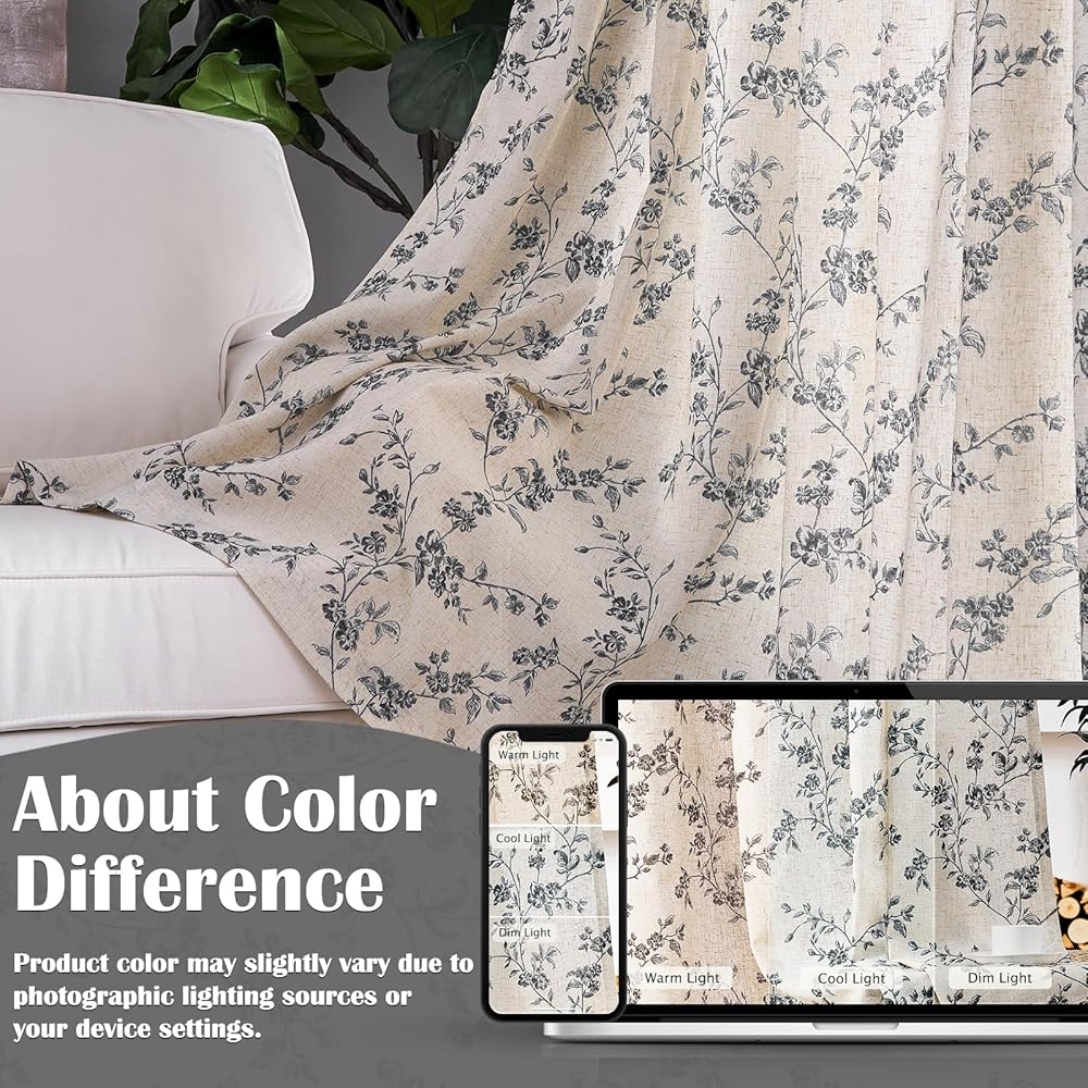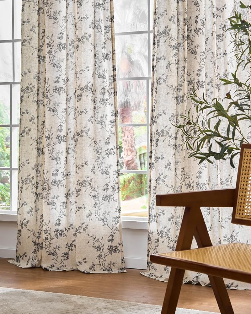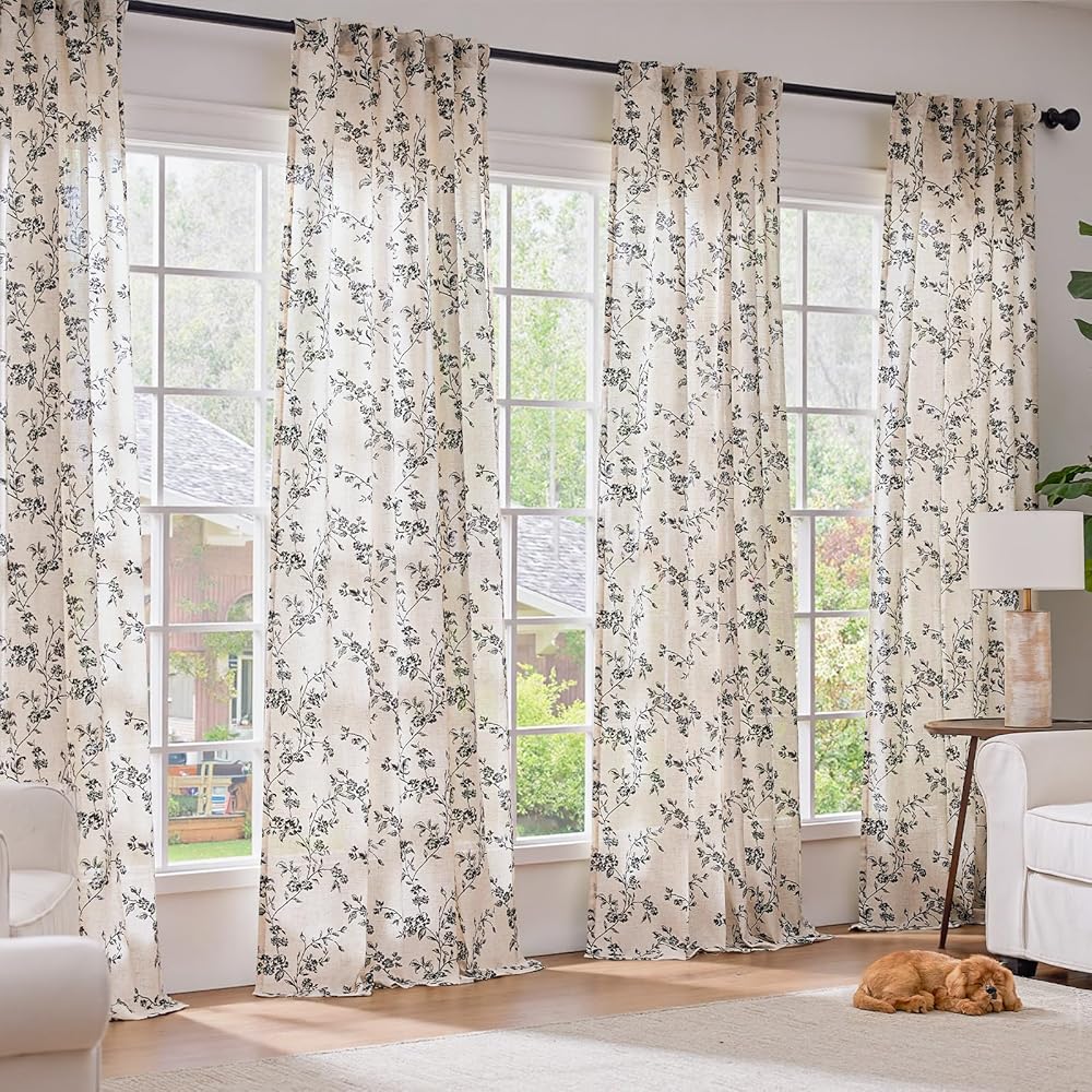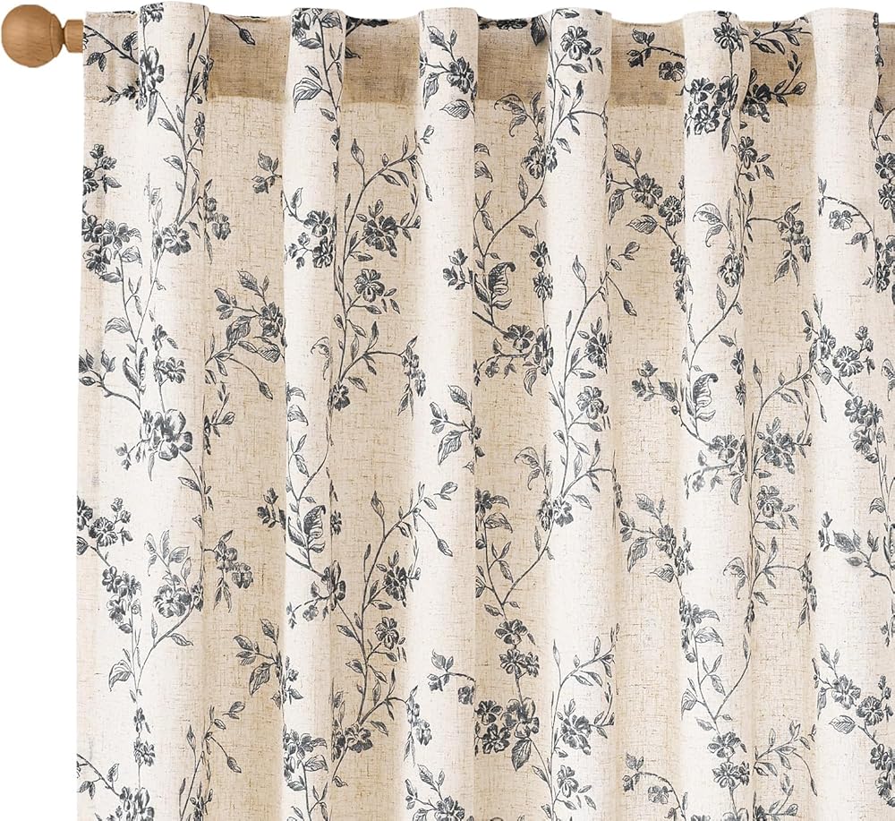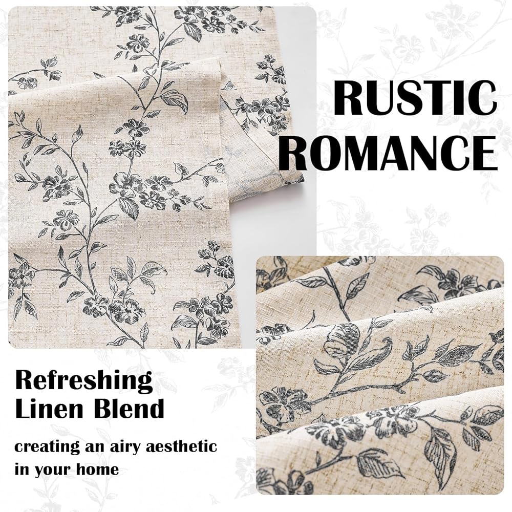 Lazzzy Farmhouse Linen Curtains Black Floral Curtains 96 Inch Length Back Tab Drapes for Living Room Bedroom Light Filtering Country Vintage Rod Pocket, 2 Panels, Black on Beige