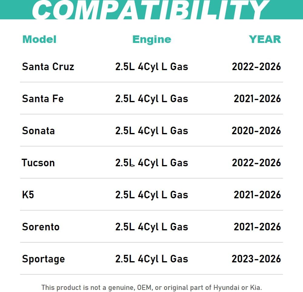 COMPATIBLE WITH: Santa Cruz 2.5L Gas (2022-2026), Santa Fe 2.5L Gas (2021-2026), Sonata 2.5L Gas (2020-2026), Tucson 2.5L Gas (2022-2026), K5 2.5L Gas (2021-2026), Sorento 2.5L Gas (2021-2026).