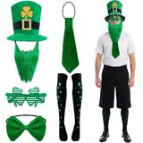 Complete St. Patrick's Day Leprechaun Set: This 5-piece costume includes a green top hat with attached beard, shamrock glasses, printed socks, necktie, and bow tie for an instant festive Irish look.