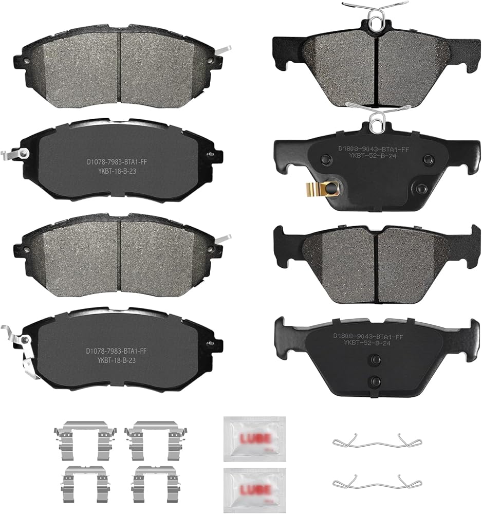 • 【BUYER NOTICE】:The product package contains 8pcs brake pads (4 wheels) , Hardware set and synthetic lubricant for reduced resistance on sliding contact points. Please make sure your vehicle matches them before buying. (Please feel free to contact us if you have any question about the item or the fitment.)