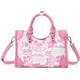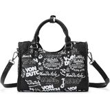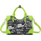 Every surface carries the Von Dutch graffiti signature — script, block, and cursive lettering, the Calabasas address, iconic wings, and star graphics. A designer-level finish on one of the most sought-after ladies handbags in the Von Dutch lineup — purses and bags built to be worn, not saved.