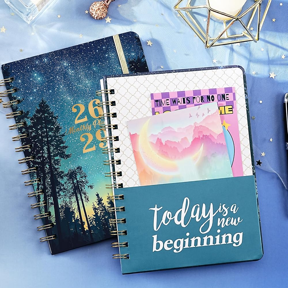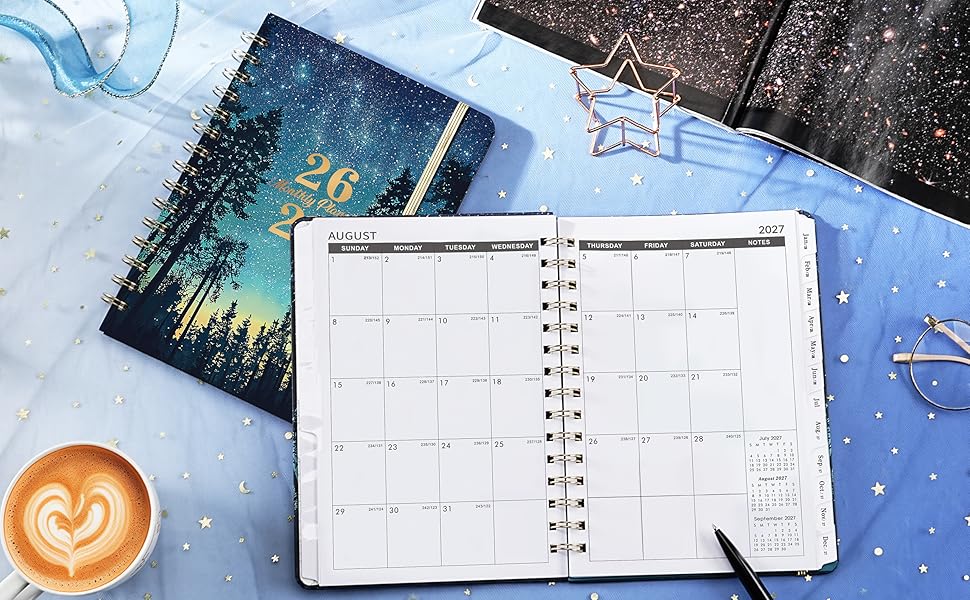 Practical and Portable - Planner 2026-2027 features monthly tabs with year indicators for easy navigation. It includes a back pocket for storing receipts and an external elastic band for securing items. Its compact size fits neatly into bags while offering ample writing space.