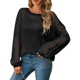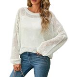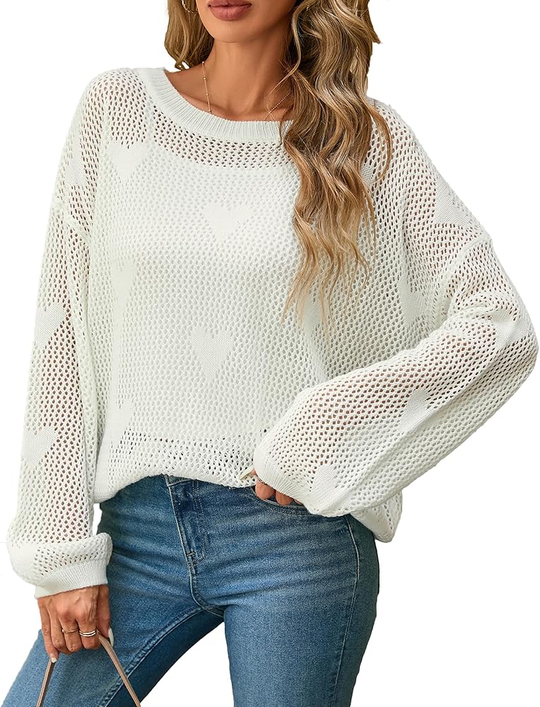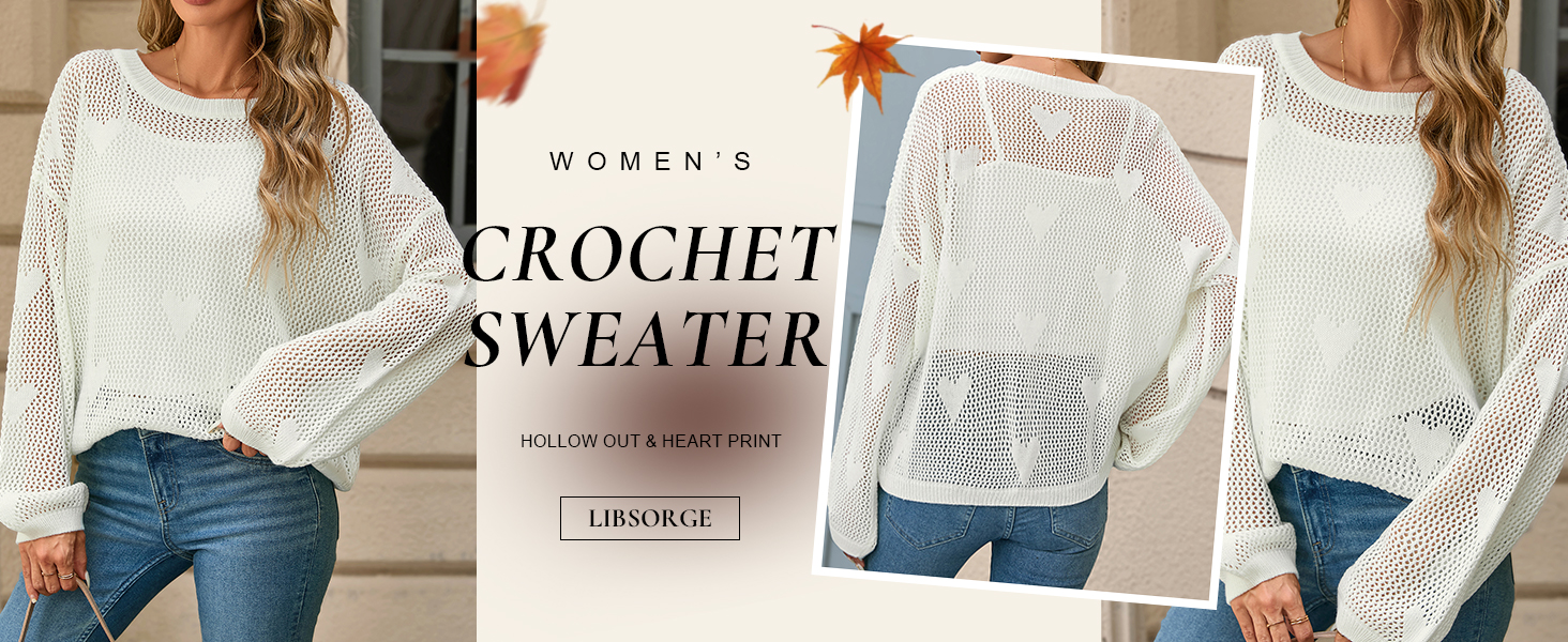Design Features: This pullover sweater showcases a playful heart pattern in a hollow-out crochet knit. It features a classic crewneck, long sleeves, and drop shoulders, combining casual charm with a hint of playful elegance.