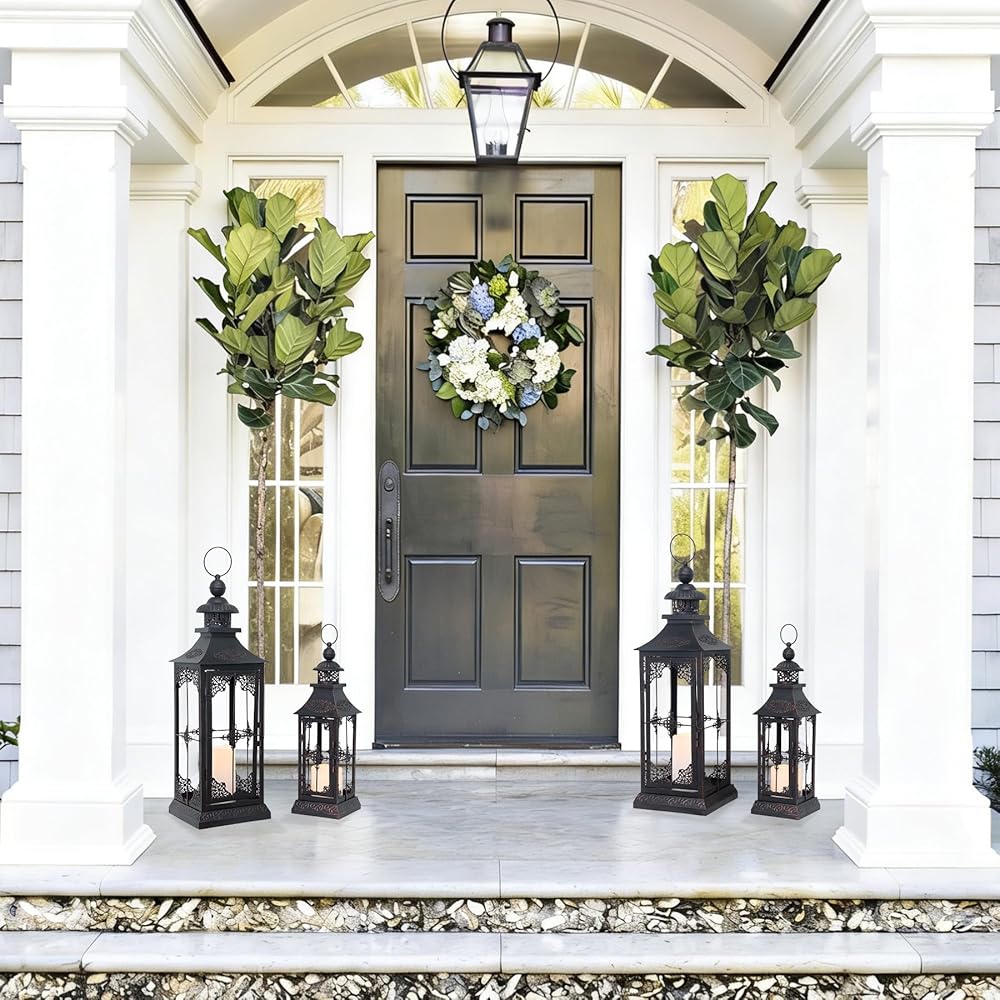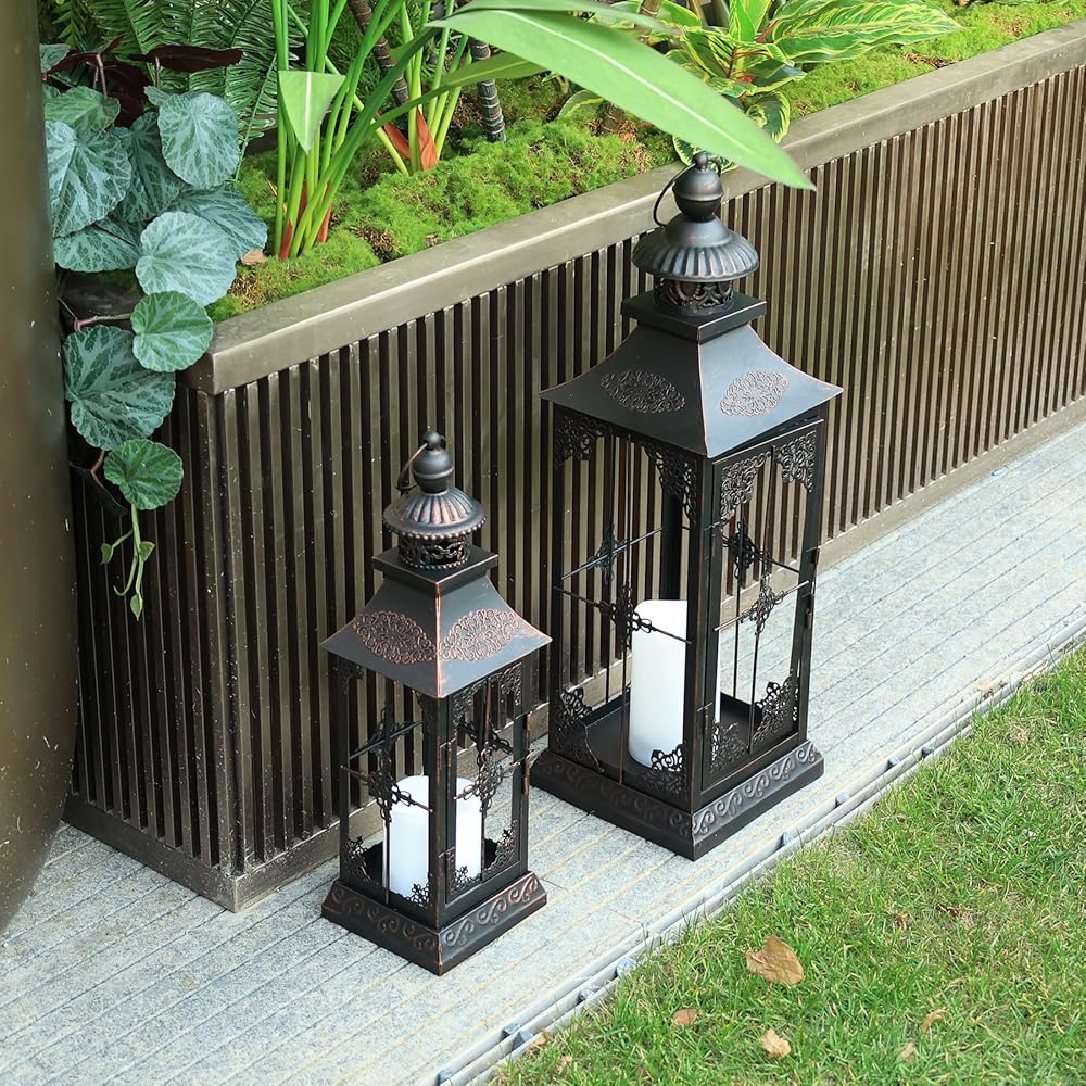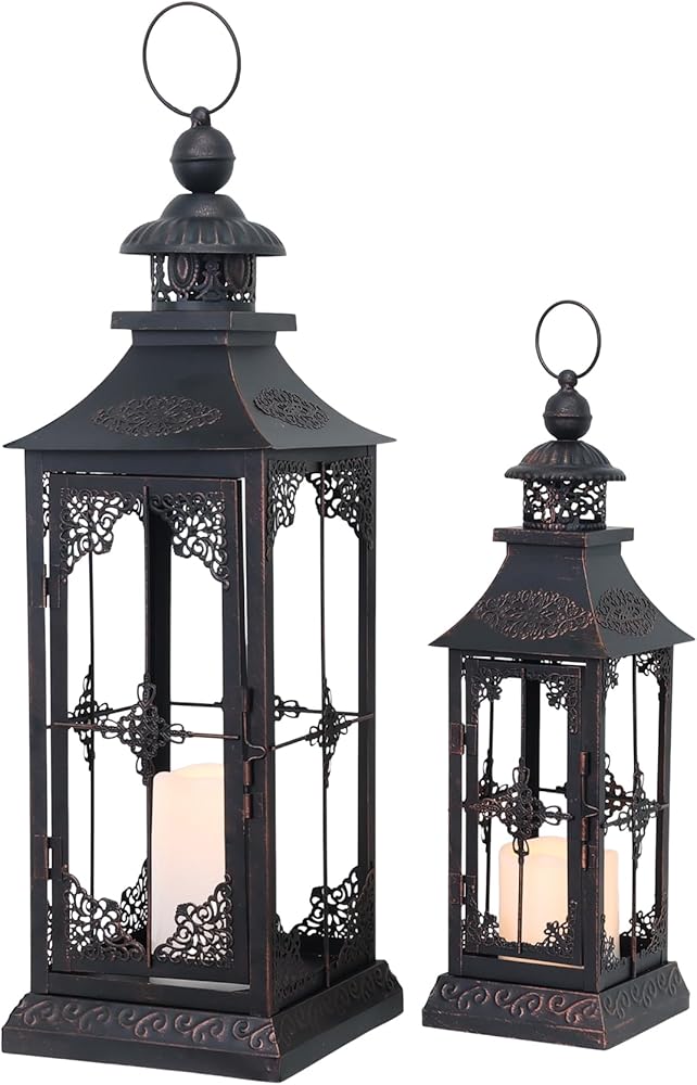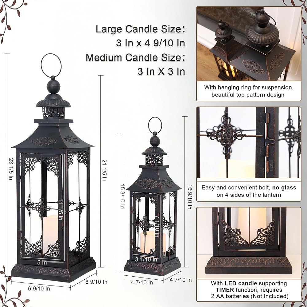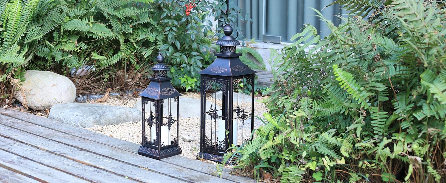 STURDY BUILD - Strong metal frames distressed by black powdering for weather resistant use.The quality materials and craftsmanship make it long-lasting decorative use even in outdoor public places such as bars and photo studios. Place an LED candle inside the lantern to illuminate your space in a soft and dreamy glow. Large 6 9/10"L x 6 9/10"W x 21 1/5"H ( 23 1/5"H with ring ). Medium 4 7/10"L x 4 7/10"W x 15 3/10"H (16 9/10"H with ring ).