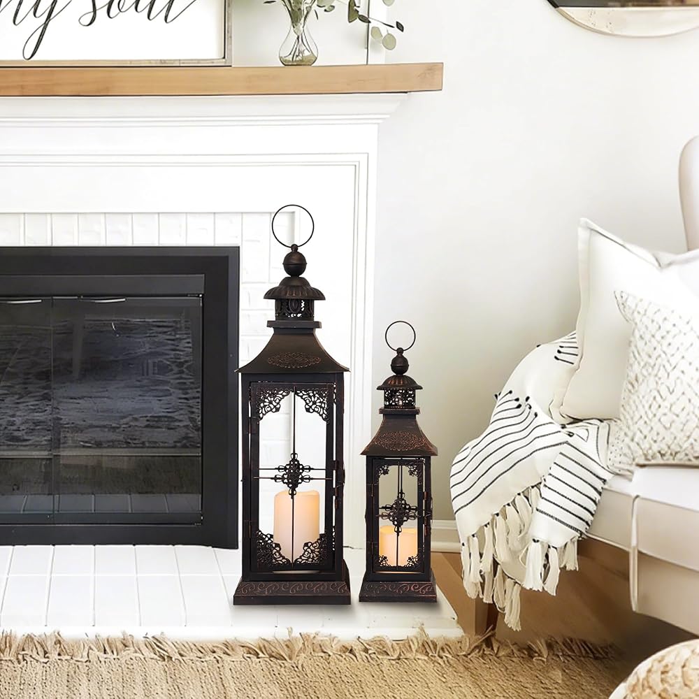 DECORKEY LED Lanterns Decorative Outdoor&Indoor, 23'' 16‘’ Large Black Lanterns Set with 2 Flameless Candles, Metal Holders for Porch, Patio, Garden, Home, Fireplace, Christmas Decorations Decor