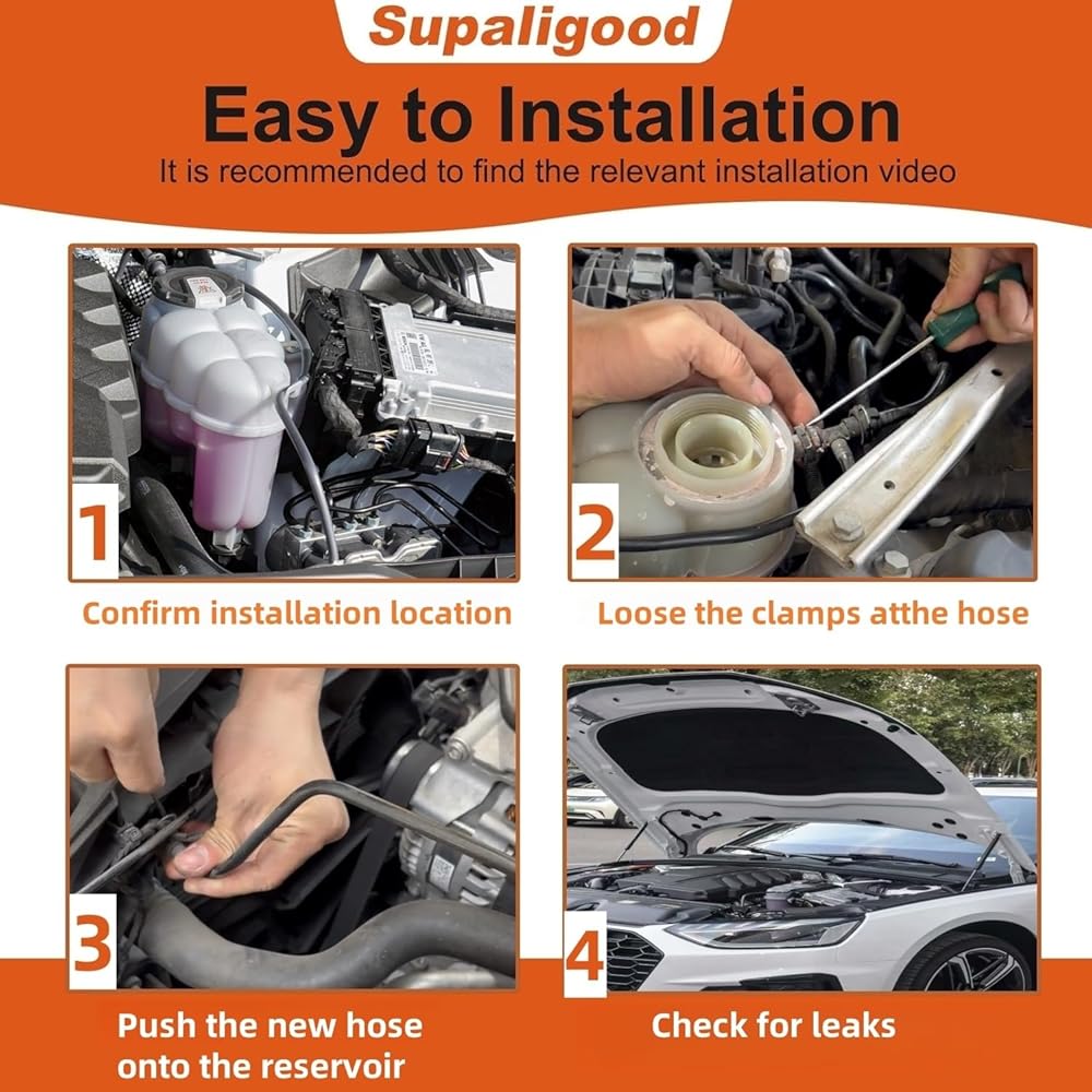 [ Easy to Install ] 1.Confirm OE number and installation location on your old radiator reservoir hose. 2. Use pliers to loosen the clamps at both ends of the coolant reservoir tank hose. 3. Push the hose onto the reservoir and radiator connections until the expansion tank hose is snugly fitted. 4. Top off the coolant, start the engine, and check for leaks