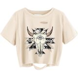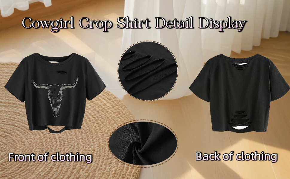 Features: funny cow skull graphic distressed shirts for women with stylish graphic printed, boho cowgirl classic round neck,rock bank short sleeve,country music concert trendy distressed ripped designed, casual loose fit cropped top