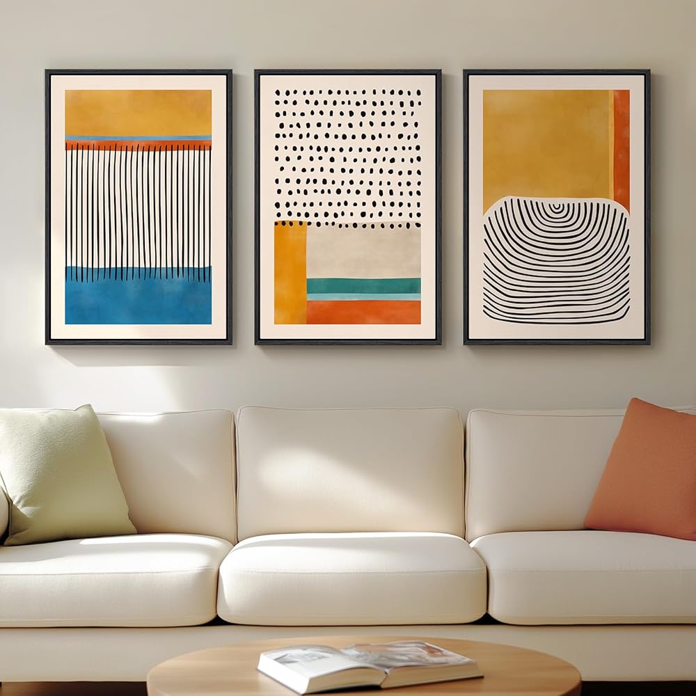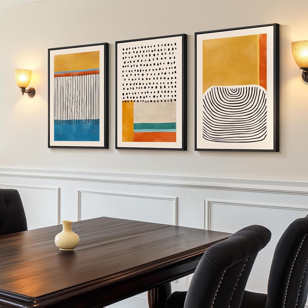 لوحة فنية جدارية تجريدية ملونة مؤطرة لغرفة المعيشة، 3 قطع من اللوحات القماشية الحديثة في منتصف القرن للجدران، صور بخطوط صفراء زاهية لديكور جدار غرفة النوم في الردهة - 16 × 24