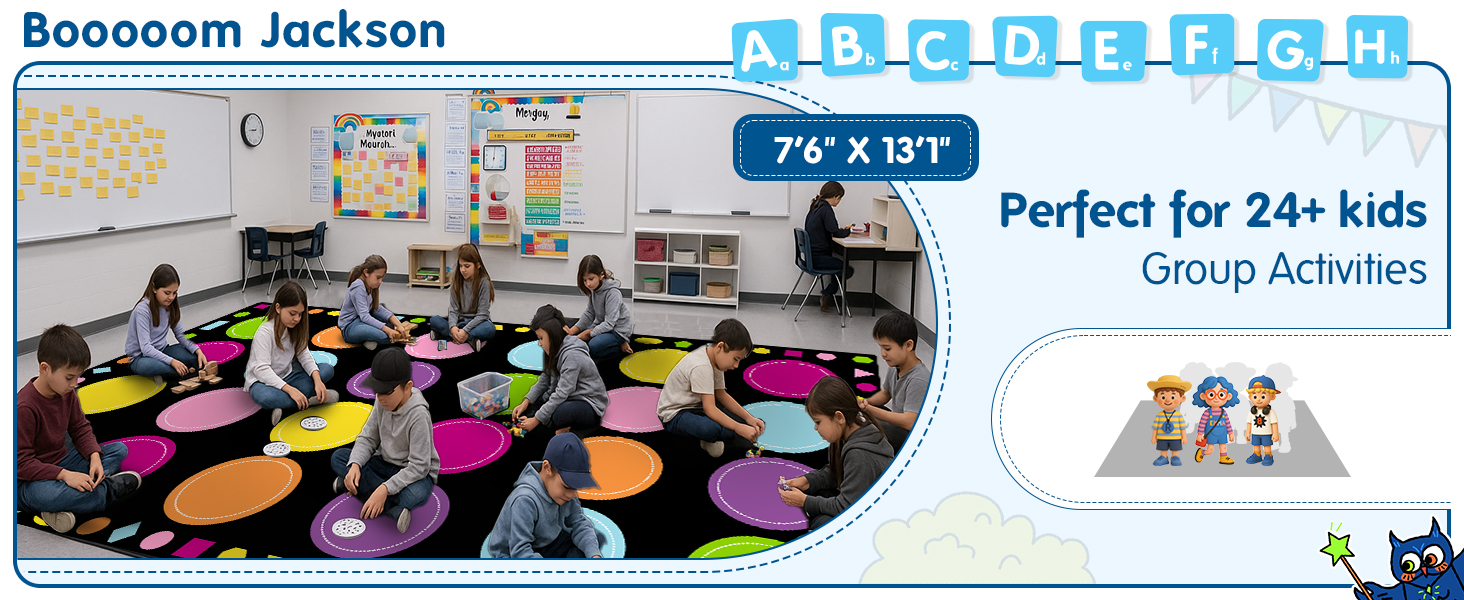 تصميم فريد من نوعه: تتميز سجاد غرفة اللعب ذات الدوائر الملونة مقاس 7'6''x13' بألوان نابضة بالحياة وتصميم جذاب. تعتبر سجادة المكتبة هذه مناسبة تمامًا للفصول الدراسية الملونة وغرف النوم المنزلية ومراكز الرعاية النهارية والمكتبات والمزيد. مظهرها الجذاب هو وسيلة مؤكدة لجذب انتباه الأطفال وإثارة خيالهم بشكل فعال