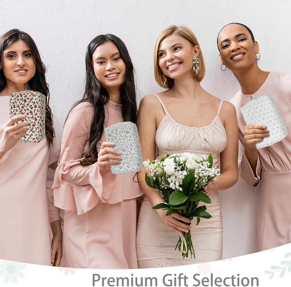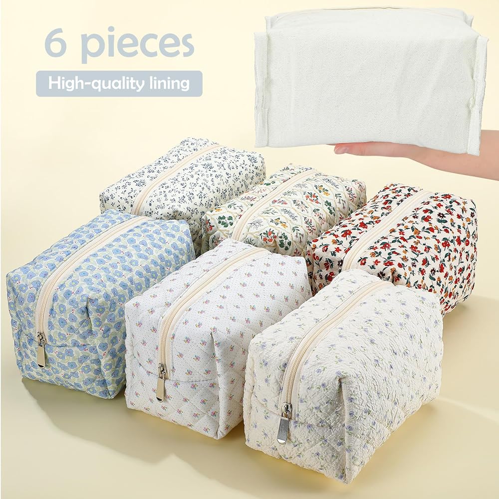 6 Pcs 8 Inch Large Quilted Makeup Bag Bulk Floral Cosmetic Bag Bridesmaid Gifts Women Floral Cotton Quilted Pouch Travel Toiletry Coquette Aesthetic Makeup Organizer for Women