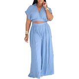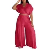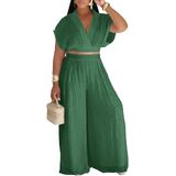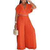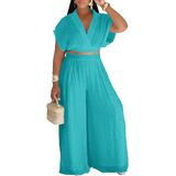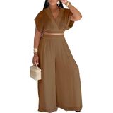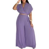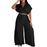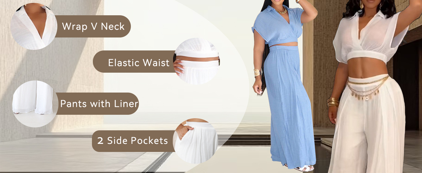 Design:The 2 Piece Sets consist of a cropped top and wide leg pants.The crop top with wrap v neck,cap sleeve,a litter sheer,wide leg pants feature with liner and pockets,elastic high waist,full-length pants.