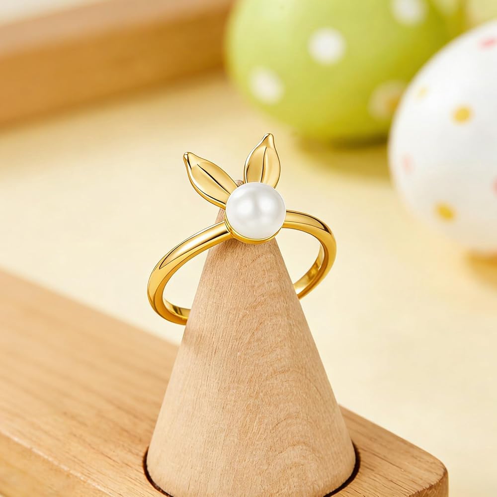 Cute Easter Ring: This gold ring showcases a playful bunny ear with a 6mm simulated pearl, capturing the whimsical spirit of Easter. The cute animal motif makes it a charming addition to holiday outfits and everyday wear.
