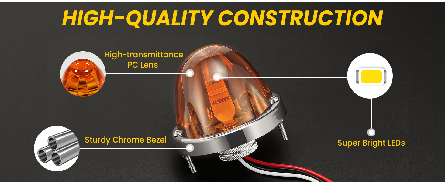 Dual Lighting Modes for Maximum Visibility- Each light features two illumination modes — steady amber for continuous lighting and strobe mode for high visibility in harsh weather. Built-in super bright LEDs deliver uniform light projection through a premium PC lens, ensuring your vehicle stands out day and night.