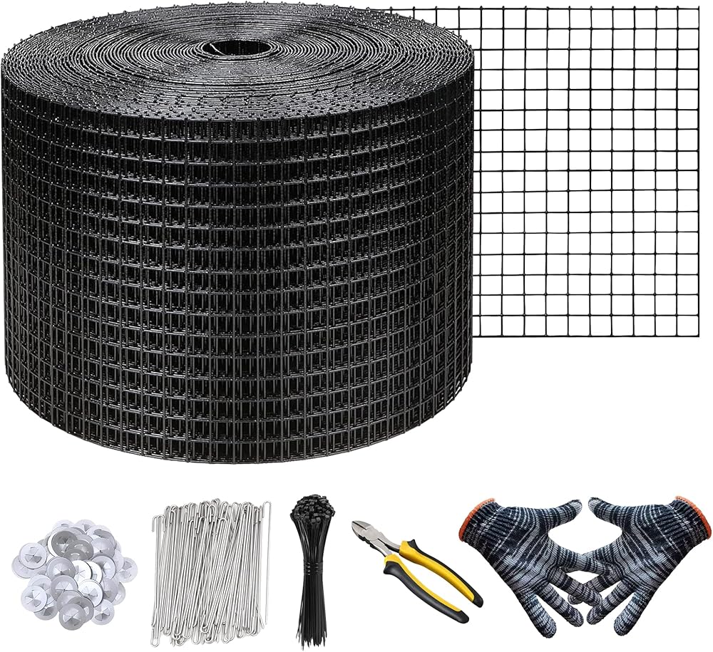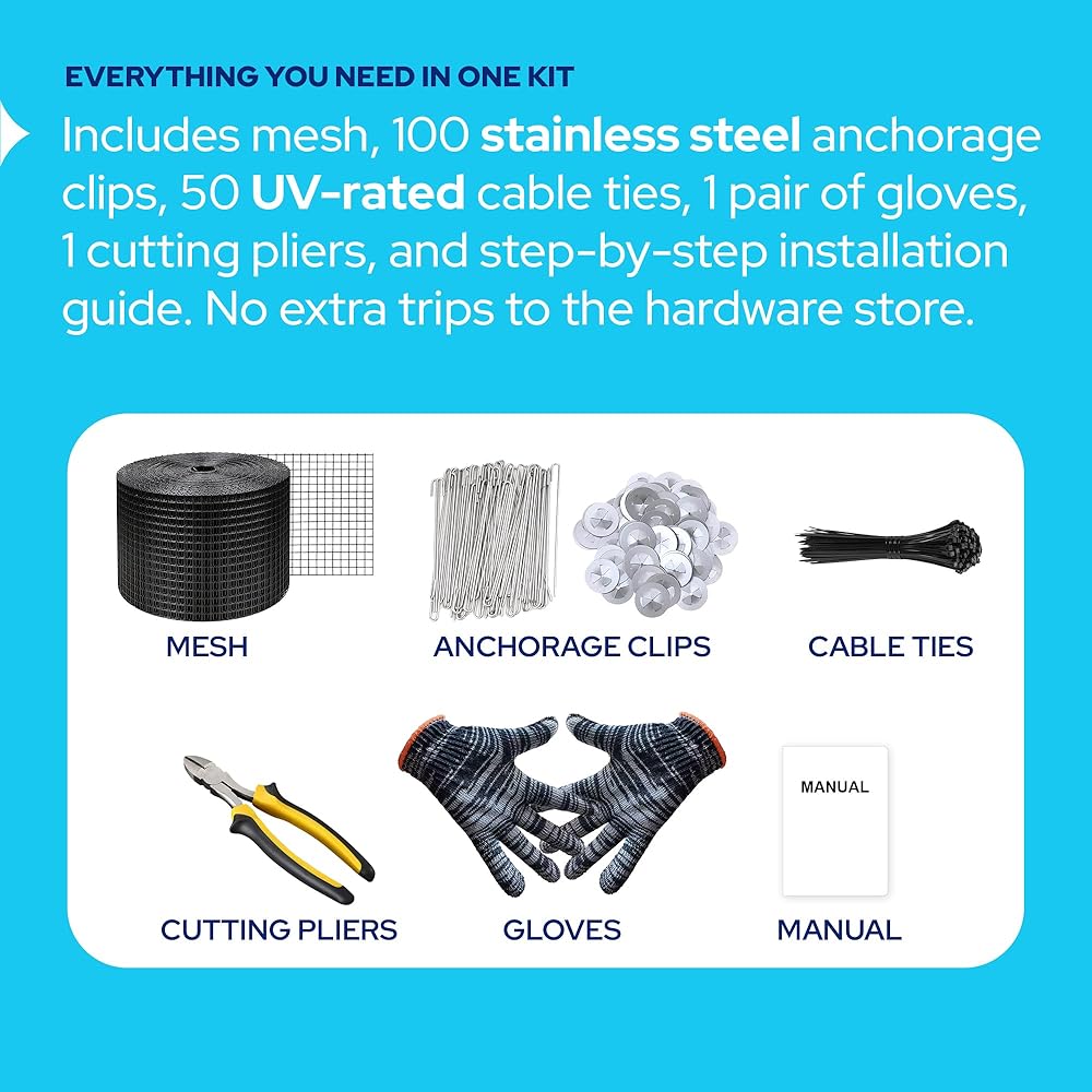 ✅ INCLUDES EVERYTHING YOU NEED: 6in x 100ft PVC coated wire mesh bird netting, 100 fastener clips, 50 zip ties, 1 cutting pliers, 2 gloves, and a step-by-step manual for smooth, frustration-free installation.
