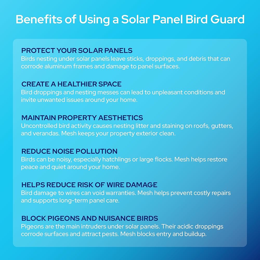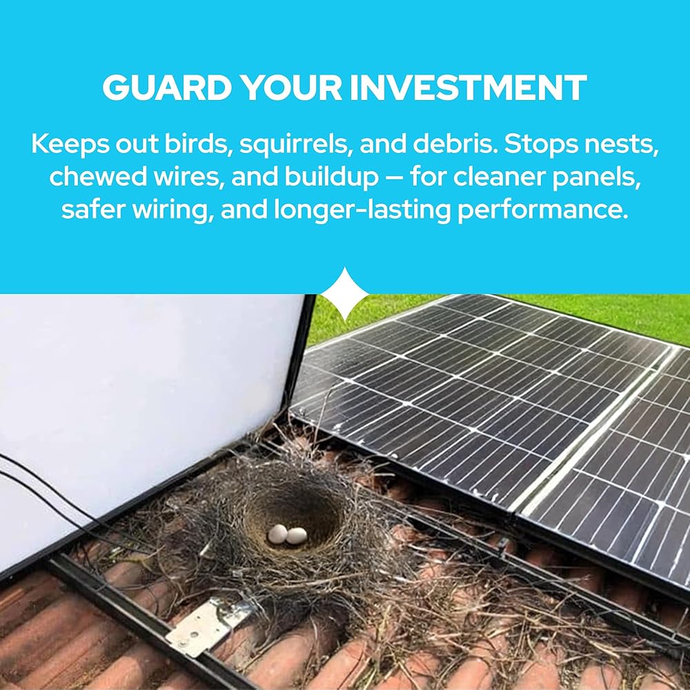 ✅ NO-DRILL, WARRANTY-FRIENDLY INSTALLATION: Our solar panel wire mesh bird barrier clips under the panel frame without tools or drilling — making setup fast, safe, and fully compliant with manufacturer warranty terms.