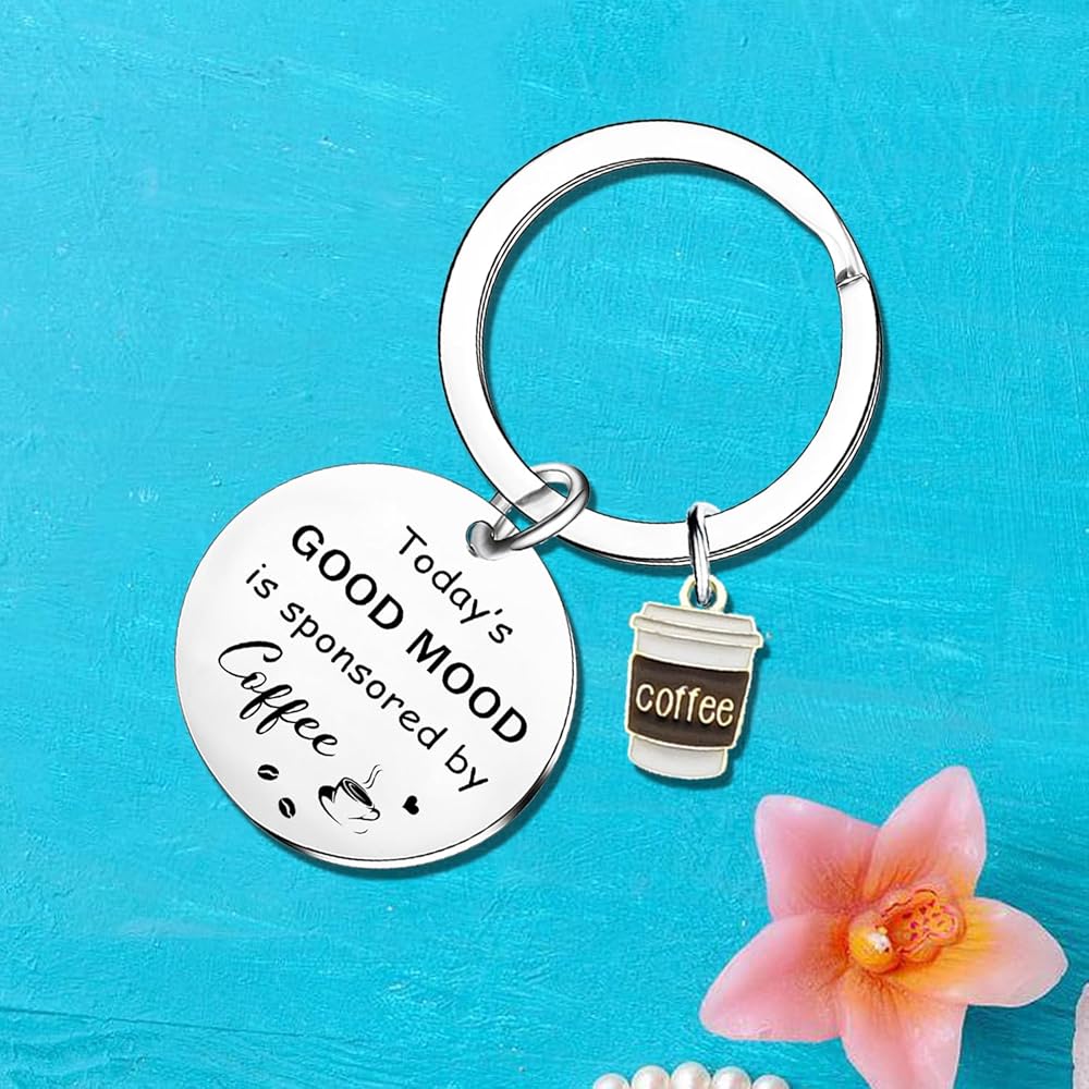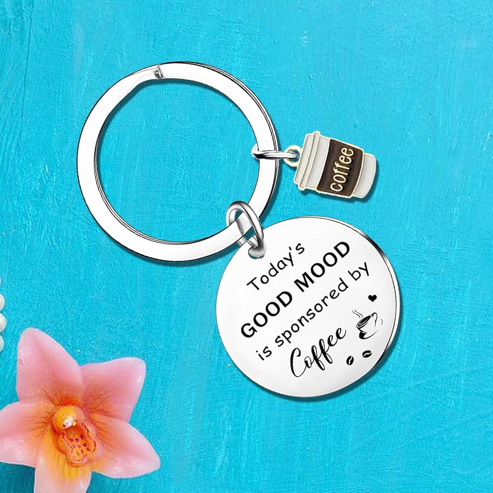 This coffee keychain is engraved with: "Today's good mood is sponsored by coffee"making it coffee accessories for coffee lovers.The playful message etched on the keychain adds a touch of humor, making it not just a gift, but a memorable keepsake