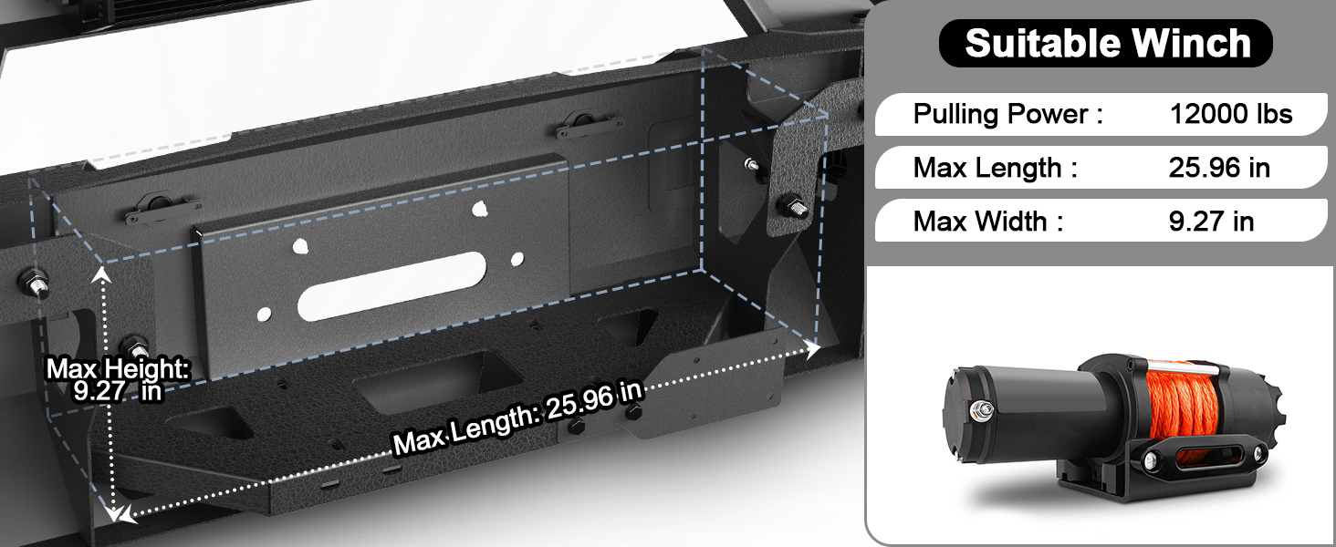 GMC Sierra 1500 Front Bumper: 3-piece modular design. Built-in winch plate rated up to 12,000 lbs. Comes with 1 144w long light bar and 2×18w LED square lights. Includes a license plate bracket, 2 D-rings, pre-drilled parking sensor holes.