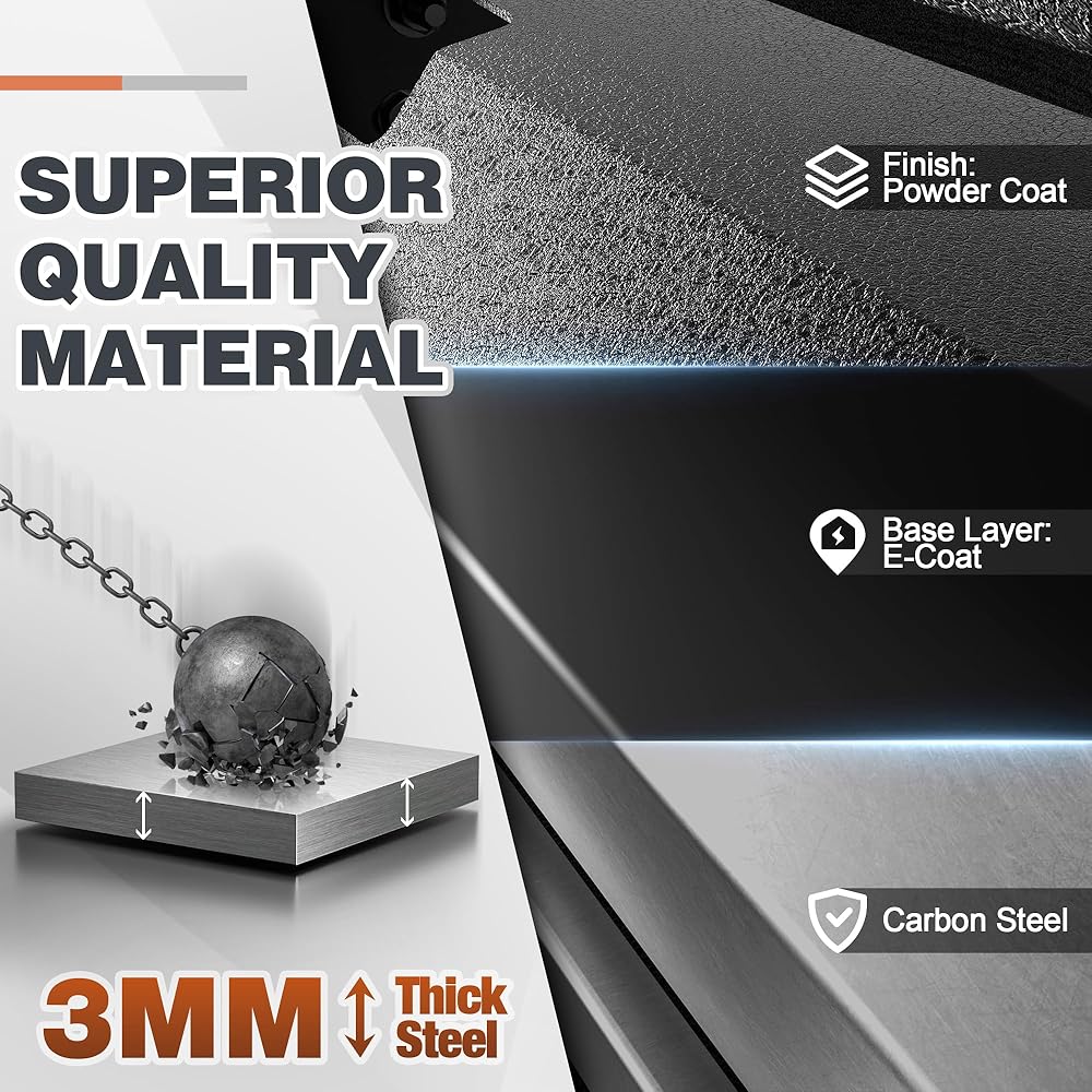 The E-coating process and textured black powder coat finish significantly enhance wear and corrosion resistance.