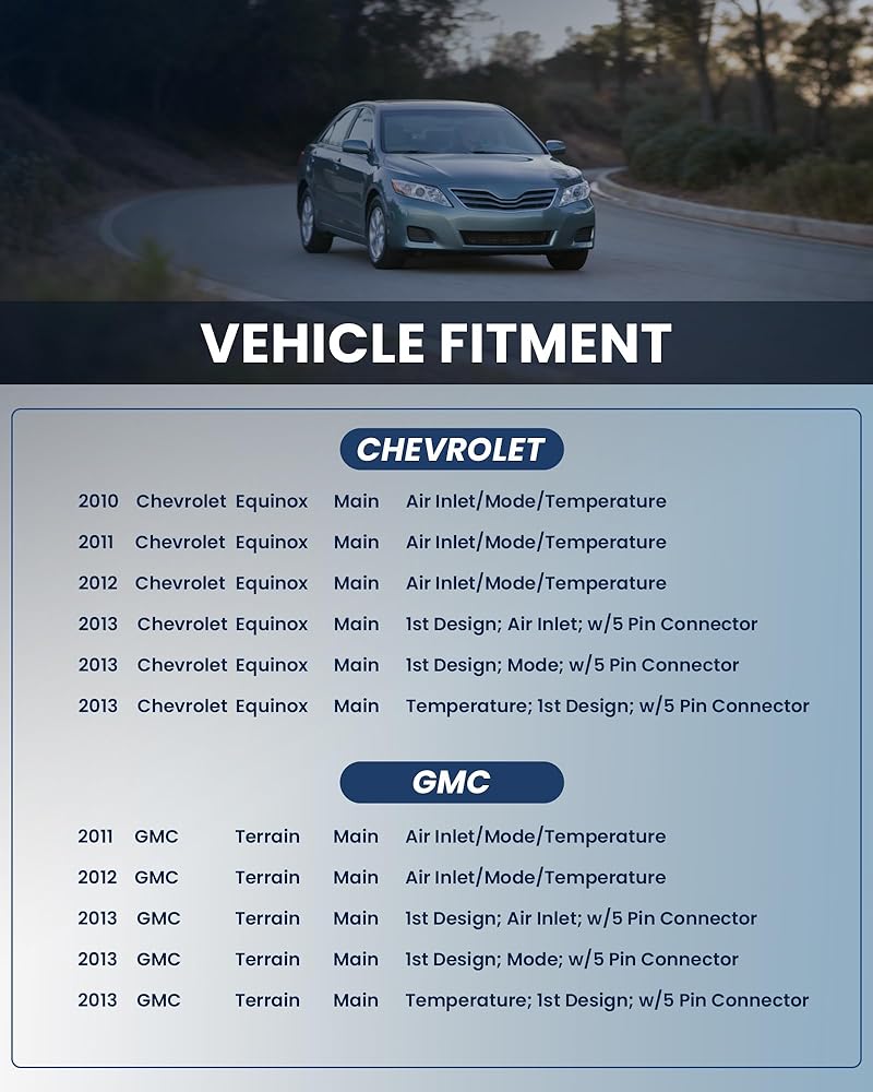 Fitment: The HVAC heater air blend door actuator compatible with 2010-1013 Chevy Equinox;2010-2013 GMC Terrain——Position: Main (The term "Main" refers to the air flow control of the Front Vents.) Unable to control the air flow control of the Rear Vents - Air Inlet/Recirculation(Controls the intake of air into the system, either bringing outside air in or using inside air in recirculation.)