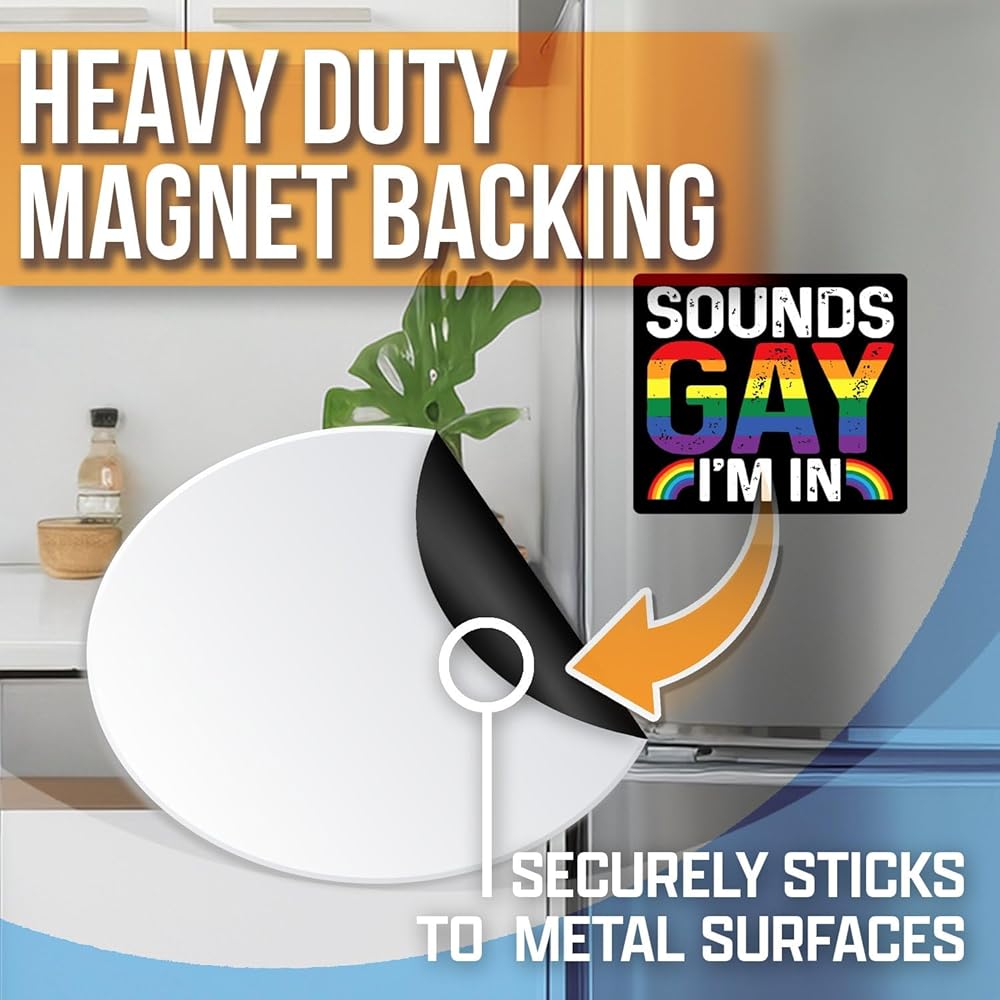 Introducing our Sounds Gay I'm In Magnets: the ideal solution for adding creativity to any metal surface! Engineered with a powerful magnet backing, these magnets securely adhere to surfaces, ensuring your designs remain in place. Featuring high-quality printing, our magnets bring your designs to life with vibrant colors and sharp details, perfect for showcasing artwork or messages. Designed to withstand outdoor conditions, they are UV resistant and waterproof, ensuring longevity in any weather. Lightweight and versatile, they are suitable for car bumpers, fridges, filing cabinets, or any metal surface, offering endless possibilities for decoration and organization. Whether promoting your business, expressing your style, or conveying a message, our flexible magnets provide a fun and effective way to personalize any space.