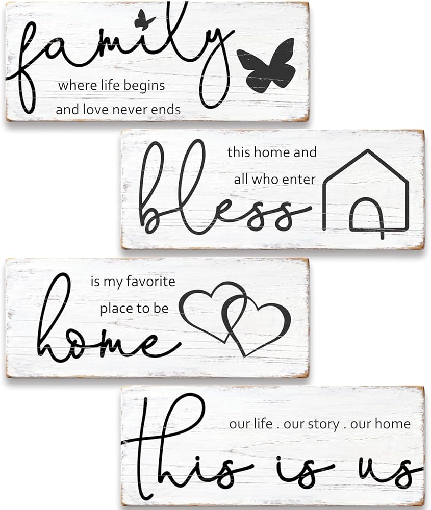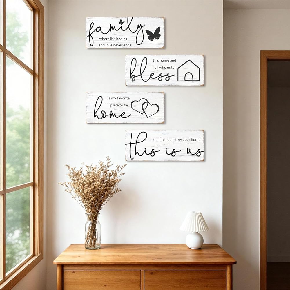 مجموعة لافتات خشبية ريفية مكونة من 4 قطع مع اقتباسات ملهمة، وغرفة المزرعة وديكور حائط للمنزل، ولوحات خشبية "Bless" "Family Where Life Begins" لغرفة المعيشة في المطبخ