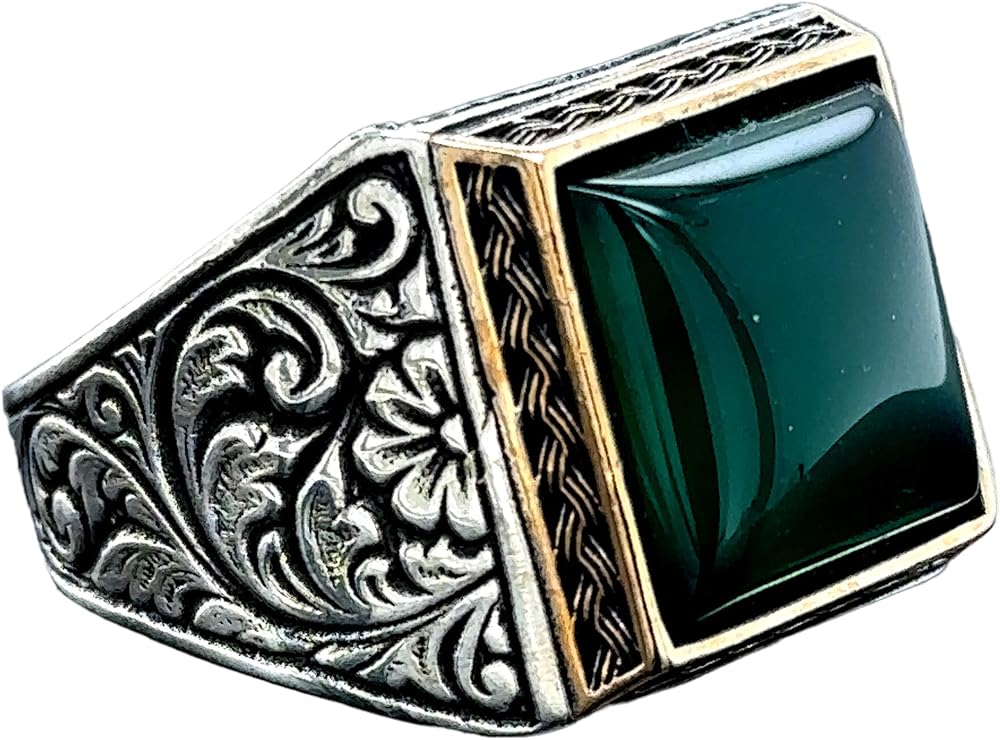 Square Green Agate Men Ring, a masterpiece of Ottoman-inspired craftsmanship and timeless elegance. Handcrafted with meticulous care, this ring features a stunning green agate gemstone set within an intricately engraved silver band. Crafted from premium 925k sterling silver, this ring boasts both durability and luxury. The square green agate stone, known for its natural beauty and soothing properties, serves as the focal point, exuding a sense of balance and tranquility. Whether worn as a symbol of personal style or as a heartfelt gift for Father's Day, this ring is sure to make a lasting impression. Its timeless design and exceptional craftsmanship ensure that it will be cherished for years to come.