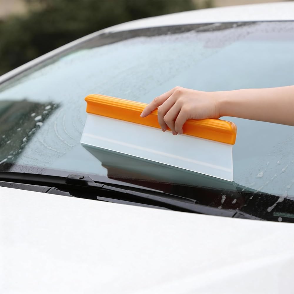 Silicone car drying squeegee with a plastic handle and a 12-inch flexible blade. Made of high-quality silicone rather than soft plastic, it features a T-shaped rubber blade that removes over 90% of moisture while being gentle on surfaces.