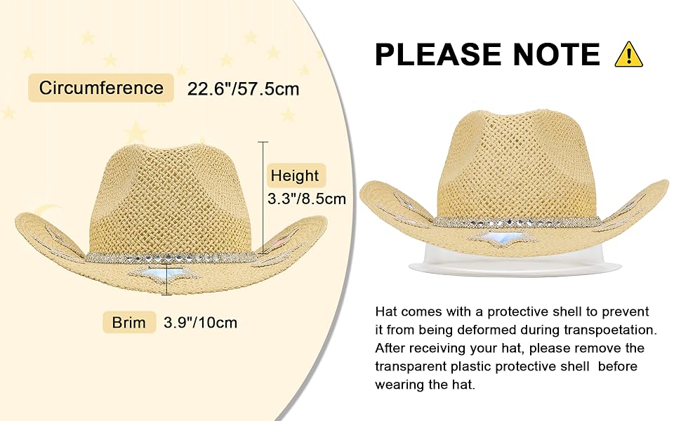 📏Perfect Size for Most Women: Circumference 22.6"/57.5 CM, height 3.3"/8.5 CM, brim 3.9"/10 CM. This western cowgirl hat has built-in elastic band ensures a snug yet comfortable fit. It also comes with a detachable windproof rope, keeping the hat securely in place while you dance, ride, or enjoy outdoor events