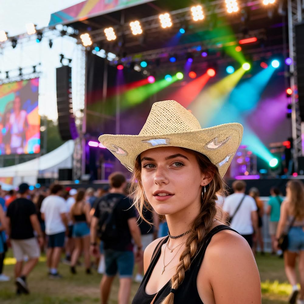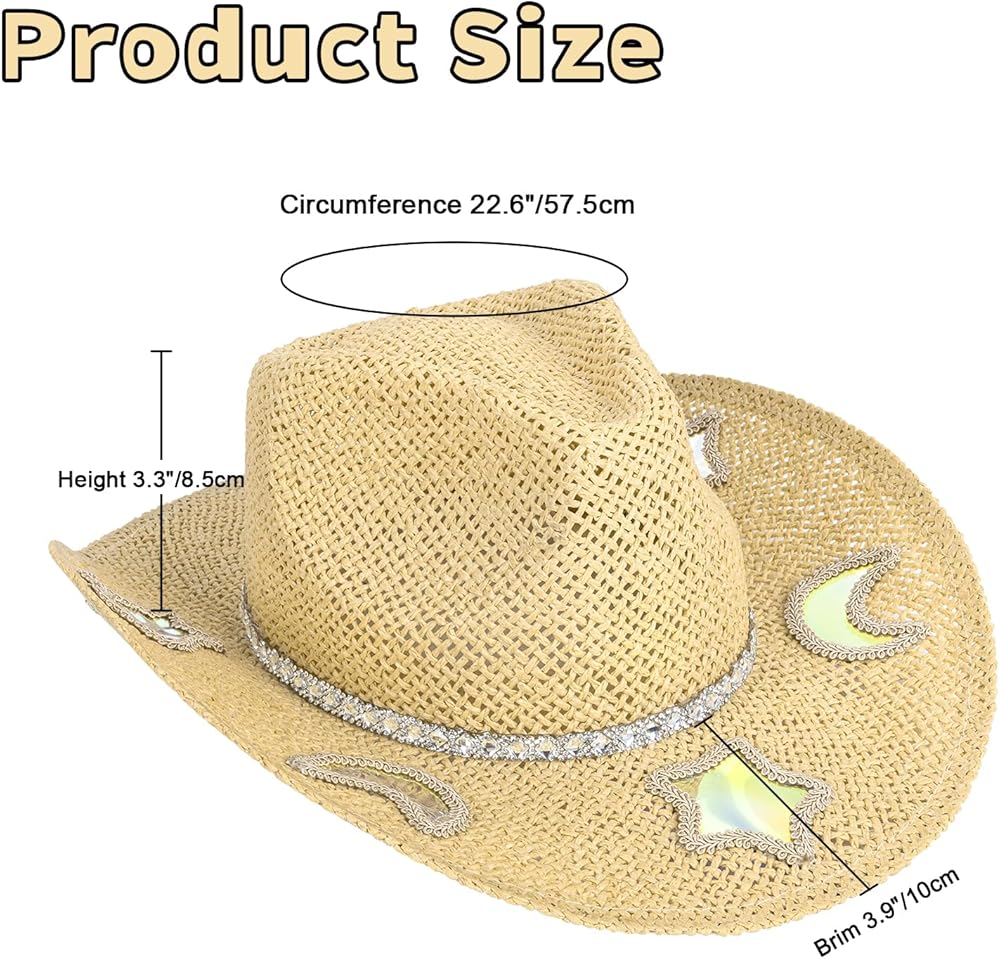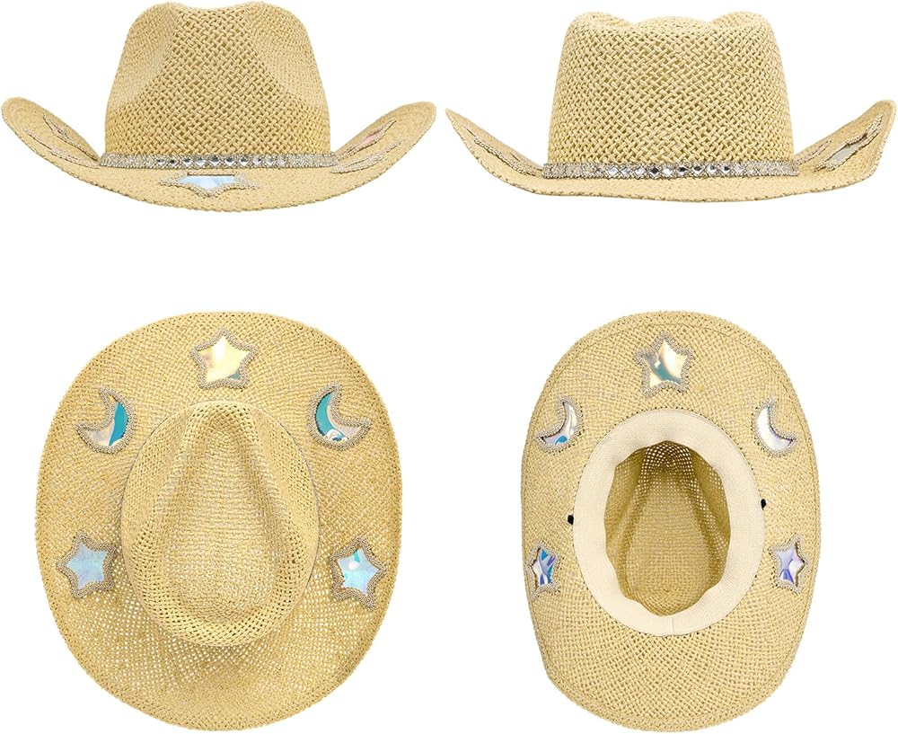 ✨ Unique Star & Moon Design: This cowboy hat features holographic star and moon patches that reflect a spectrum of gradient colors from every angle. The shimmering rhinestone chain adds extra sparkle, making the hat eye-catching from all sides. Compared with traditional straw cowboy hats, it brings a dreamy touch that perfectly blends classic western style with a unique twist—showcasing your distinctive taste