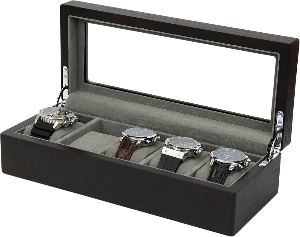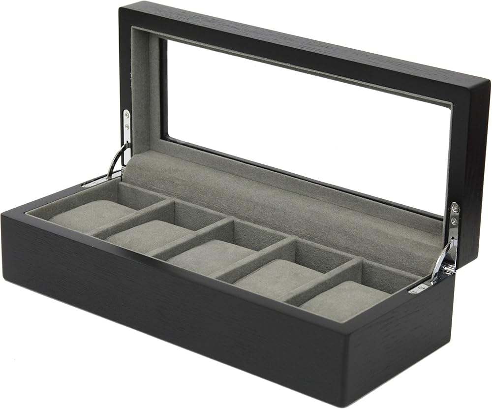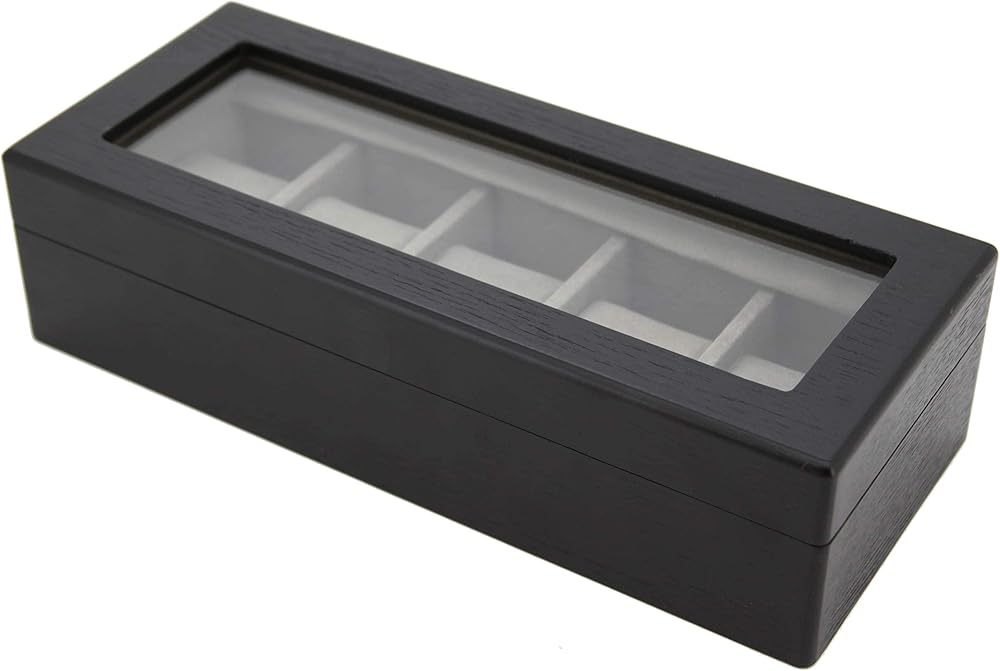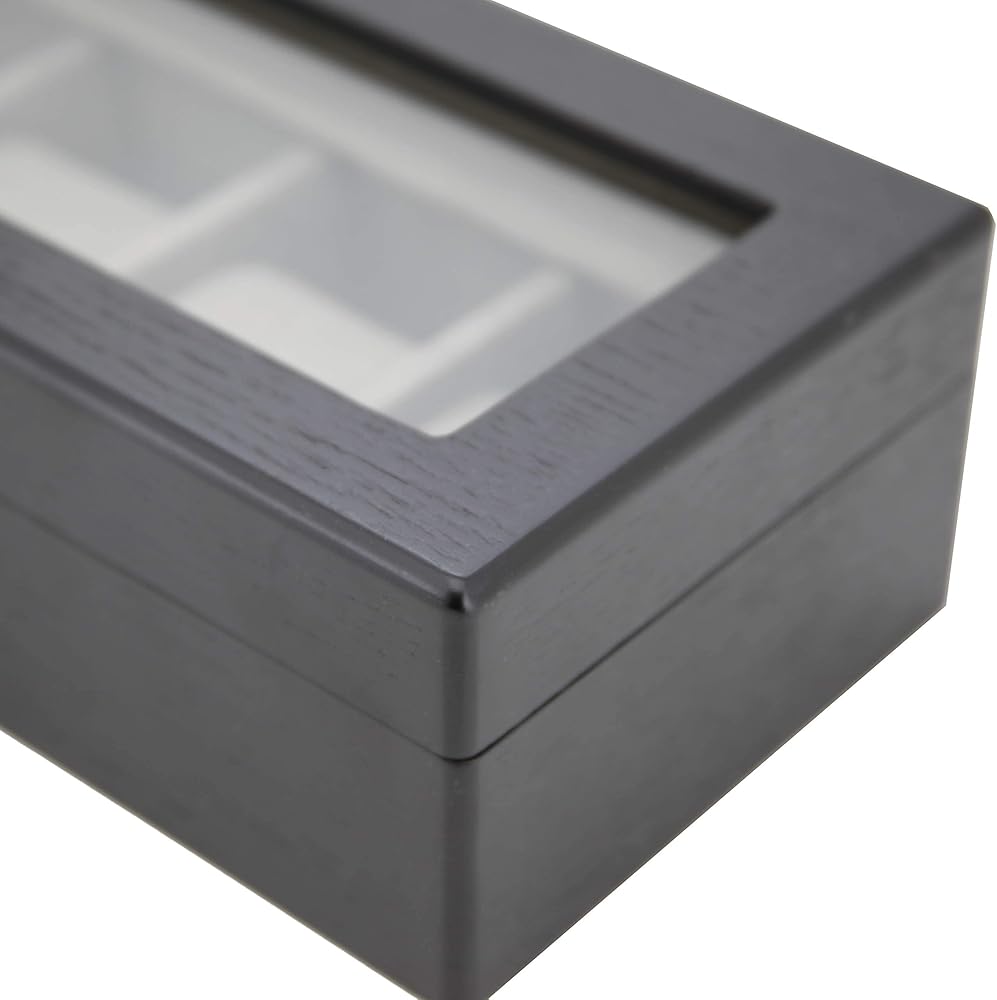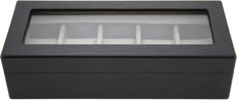 For the watch enthusiast, Tech Swiss offers this finely crafted with black finish watch boxes -Madison Collection. With a clean professional look, this wood constructed watch box will hold 5 of your finest timepieces. The compact case features a rich black ash wood grain finish, wide compartments to accommodate both oversize and regular sized watches (Fitting Watches up to 49mm), soft removable cushions to fit both men or ladies watches with high clearance for those large timepieces. The top also includes a see through panel that allows you to see what is inside without having to open and close the box. The interior is lined with a plush charcoal grey faux suede fabric. The watch case provides a soft velvet under side to prevent scratches on surface. The watch box is designed with a black scheme which complements any desk, dresser and any type of home décor. The watch case is compact enough to be placed in a personal safe or deposit box. Due to the natural occurring difference in the wood grain, slight color variations may occur. The Madison Watch Collection- also offers a 10 Watch Box and 20 Watch Box. Dimension of Box: 12.25" L x 5" W x 3 1/4"H Individual Compartment Size: 3 1/2" L x 2" W x 2 3/4"H Exclusively by Tech Swiss