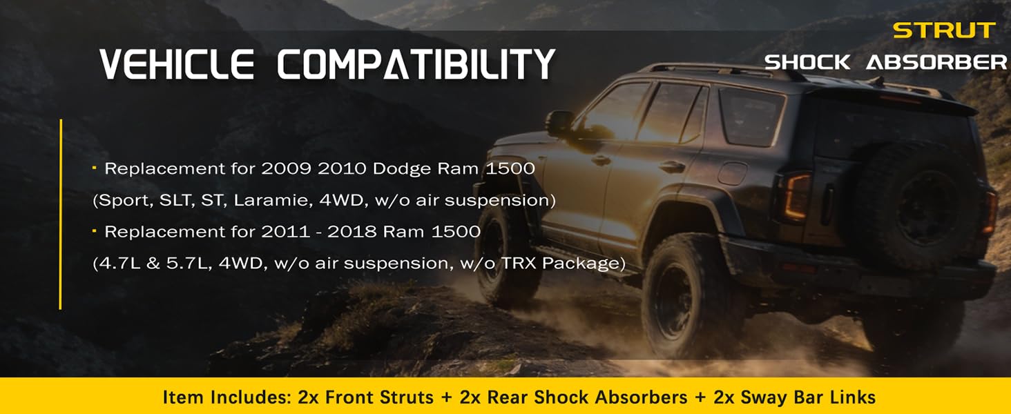 - Replacement for 2009 2010 Dodge Ram 1500 (Sport, SLT, ST, Laramie, 4WD, w/o air suspension), 2011 - 2018 Ram 1500 (4.7L & 5.7L, 4WD, w/o air suspension, w/o TRX Package)