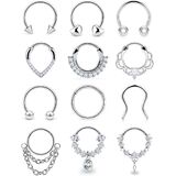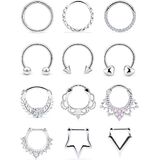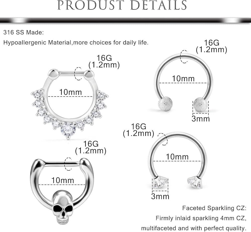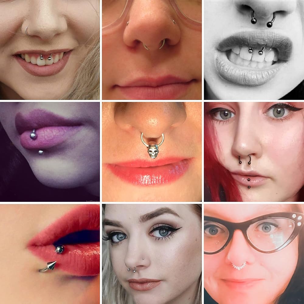 مجموعة مثالية - مجموعة اقتصادية مكونة من 16 قطعة من حلقات حاجز الأنف؛ 8 قطع من أثقال حدوة الحصان مع كرة لامعة، ومسمار، وكرة غير لامعة، وماس شفاف CZ؛ 2 قطعة من حلقات الأنف للحاجز؛ 6 قطع من جهاز الفرس الحاجز مع القلب والجمجمة والكريستال.