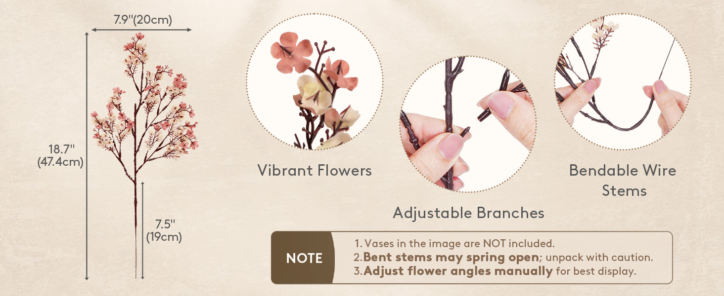 Artificial Flowers: The faux floral stems are crafted from high-quality plastic and iron wire, with soft-touch silk cloth flower heads. These heads are very firm and not prone to falling off. If a flower head becomes detached during shipping, it can be reattached with hot glue. Bent stems may spring open; unpack with caution