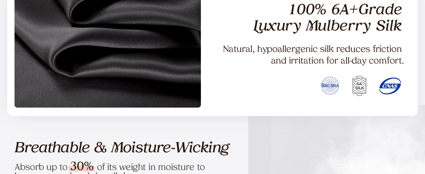 • 6A Grade Silk — Experience the luxury of 6A grade long-strand mulberry silk with a sleek satin finish, the same high-end quality used in premium products. This ultra-soft, smooth fabric feels like a second skin.