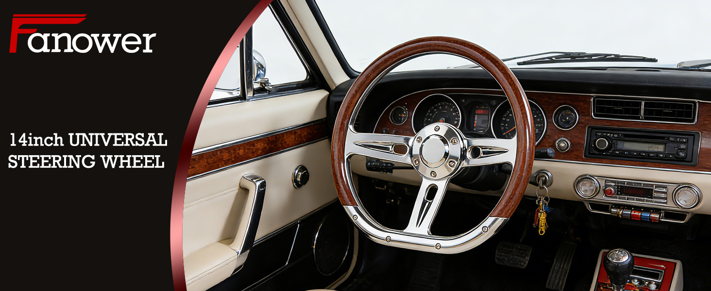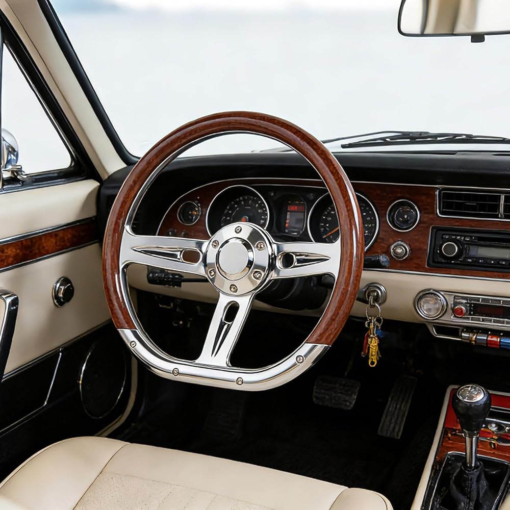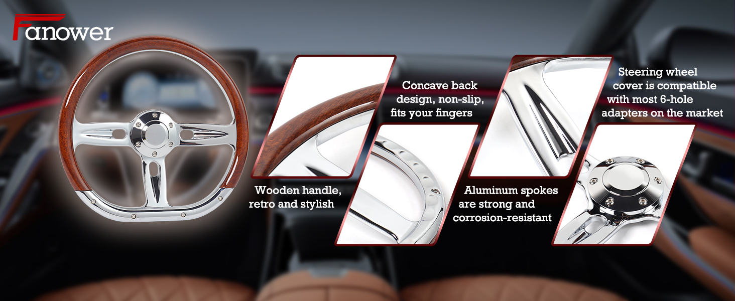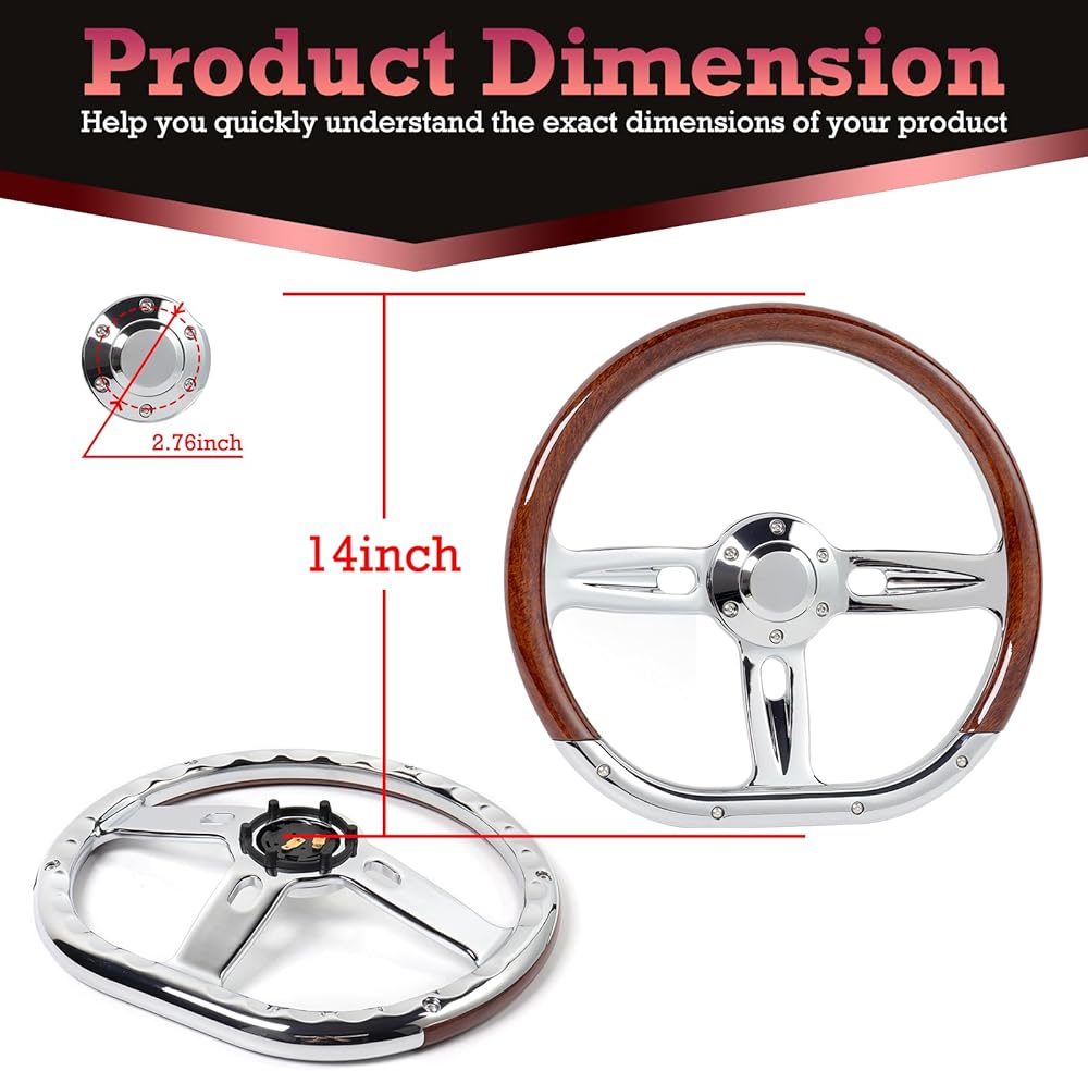 14Inch Wood D-Shape Universal Steering Wheel - Chrome-Plated Aluminum Alloy 3 Spokes 6 Holes 50mm Deep Dish for Racing Car Classic Car Vintage Car 350mm Universal Wood Grain Steering Wheel