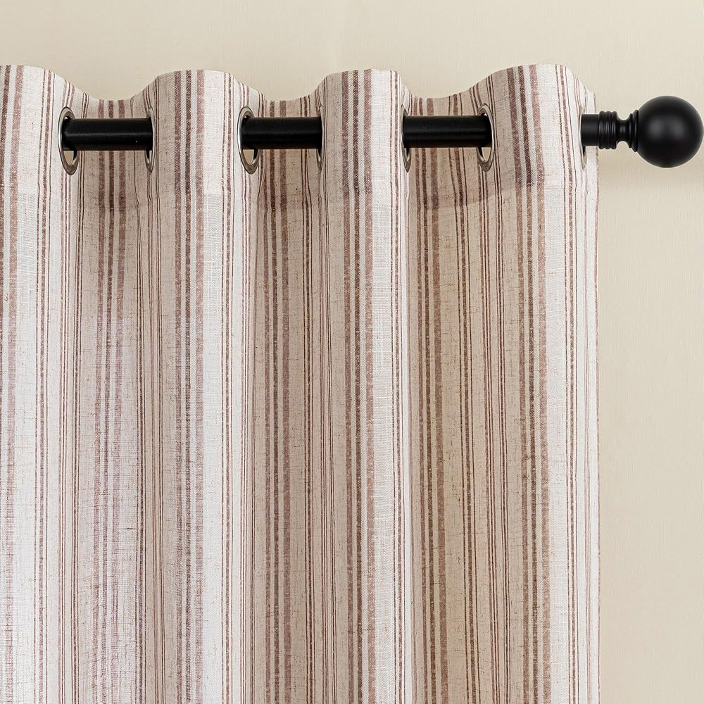 Striped Curtain Set: Two panels. 52"W x 84"L each. Warm taupe with subtle stripes. Designed to deliver cozy farmhouse style with effortless elegance, Infuse your home with gentle rustic character.