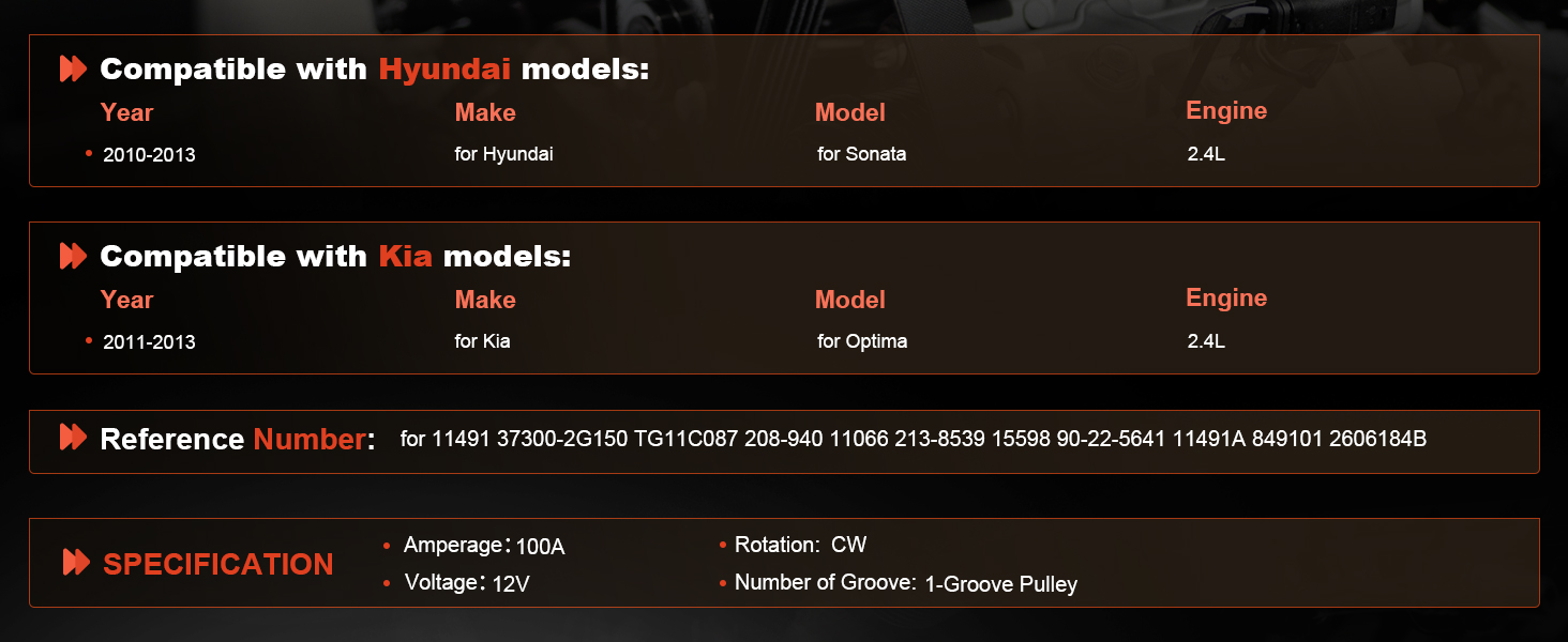 [Vehicle Fitment]:11491 Alternator Compatible with Hyundai with Sonata 2010-2013, Compatible with Kia with Optima 2011-2013.