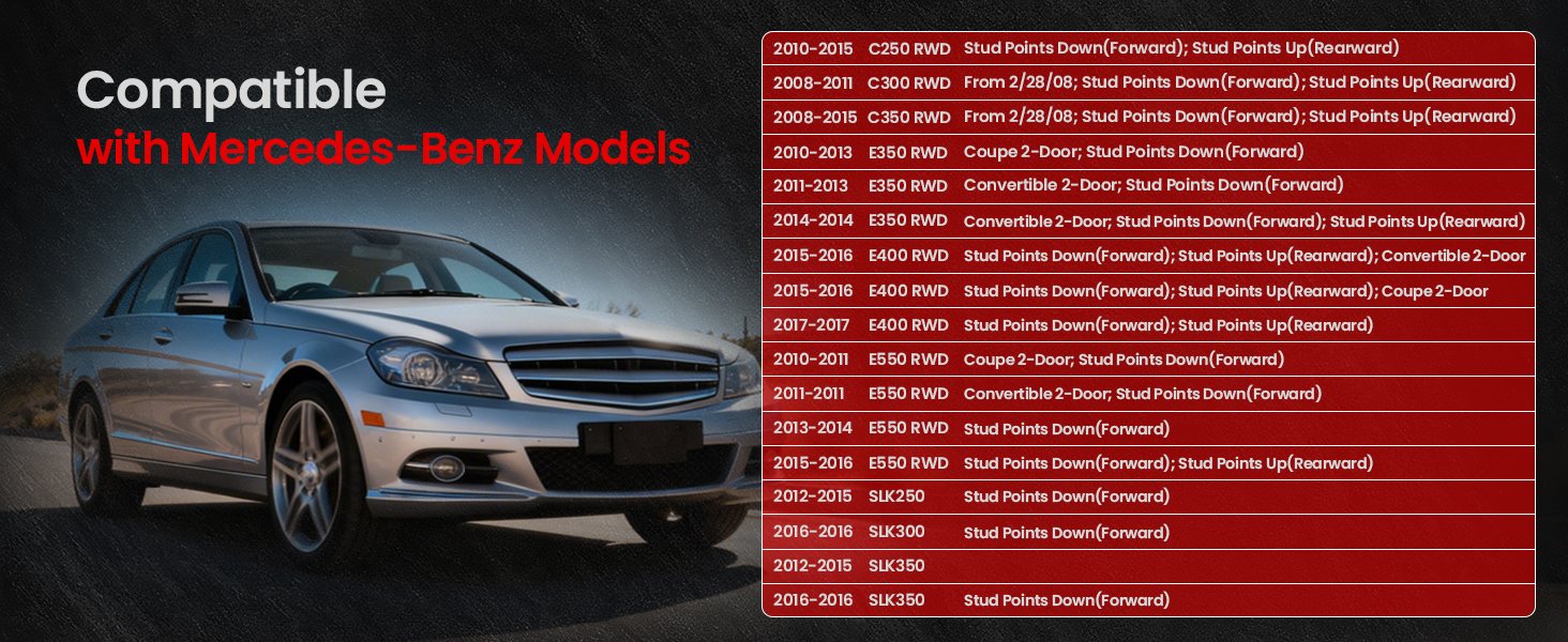 【Fitment-1】Compatible with Mercedes-Benz C250 2010-2015 (RWD), C300 2008-2011 (RWD; From 2/28/08), C350 2008-2015 (RWD; From 2/28/08), E350 2014 (RWD; Convertible 2-Door), E400 2015-2016 (RWD, Convertible 2-Door), E400 2015-2016 (RWD, Coupe 2-Door), E550 2015-2016 (RWD) --- Stud Points Down(Forward); Stud Points Up(Rearward)
