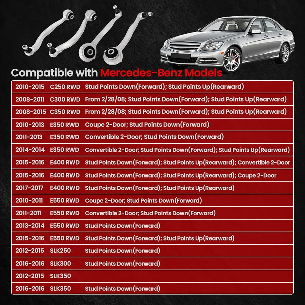 【Fitment-2】Compatible with Mercedes-Benz E350 2010-2013 (RWD; Coupe 2-Door), E350 2011-2013 (RWD; Convertible 2-Door), E550 2010-2011 (RWD; Coupe 2-Door), E550 2011 (RWD; Convertible 2-Door), E550 2013-2014 (RWD), SLK250 2012-2015, SLK300 2016-2016, SLK350 2016-2016 --- Stud Points Down(Forward)
