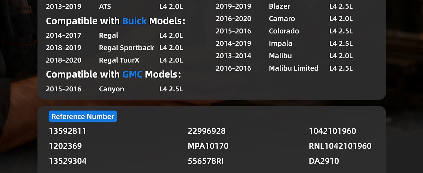 【Durability & Reliability】: Manufactured with high-quality materials and subjected to rigorous no-load, load, and full-quality testing. Designed specifically compatible with 2014-2017 Buick Regal L4 2.0L, 2018-2020 Buick Regal TourX L4 2.0L, 2019-2019 Chevrolet Blazer L4 2.5L,2016-2020 Chevrolet Camaro L4 2.0L,2015-2016 Chevrolet Colorado L4 2.5L,2013-2019 Cadillac ATS L4 2.0L, 2015-2016 GMC Canyon L4 2.5L. Verify your vehicle details and part number for a perfect, hassle-free fitment
