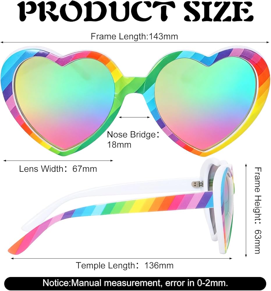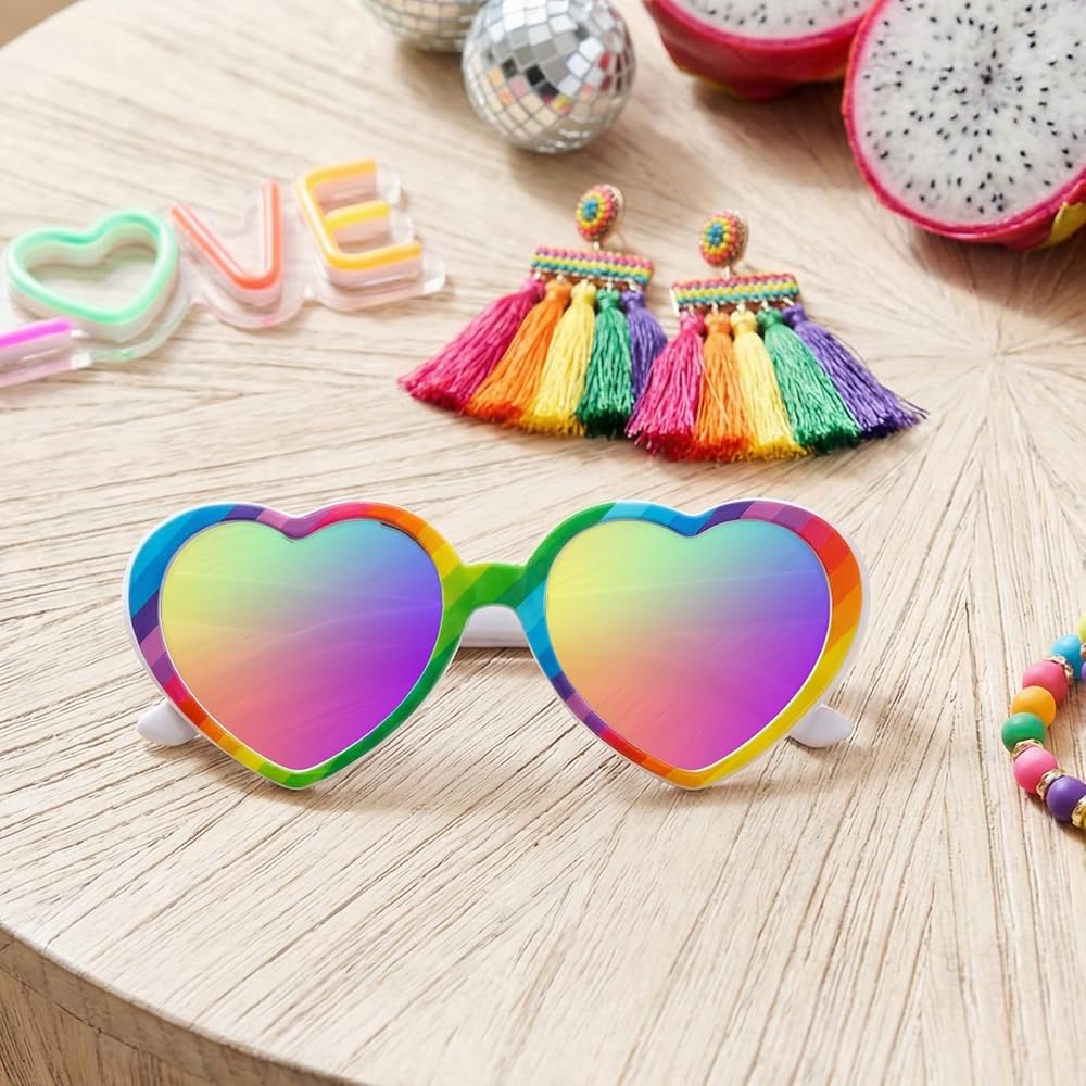• Durable Construction for Longevity:The sturdy frame of these rainbow accessories is built to resist bending and breaking, while scratch-resistant TAC lenses maintain clarity through regular wear. These heart sunglasses are designed to hold up over time, retaining their shape and vibrant rainbow look