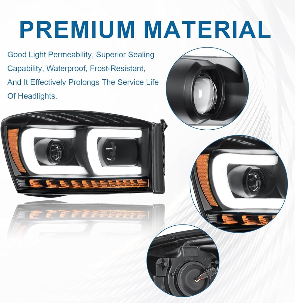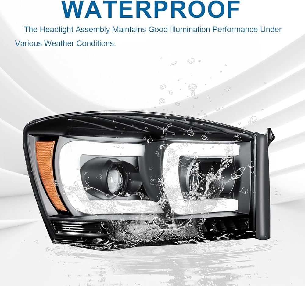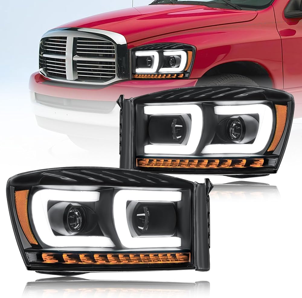 LED DRL Headlights Assembly Compatible with 2006-2008 Dodge Ram 1500 2500 3500 Left Right Side Replacement Headlamp w/Running Light Bar Black Housing Amber Reflector