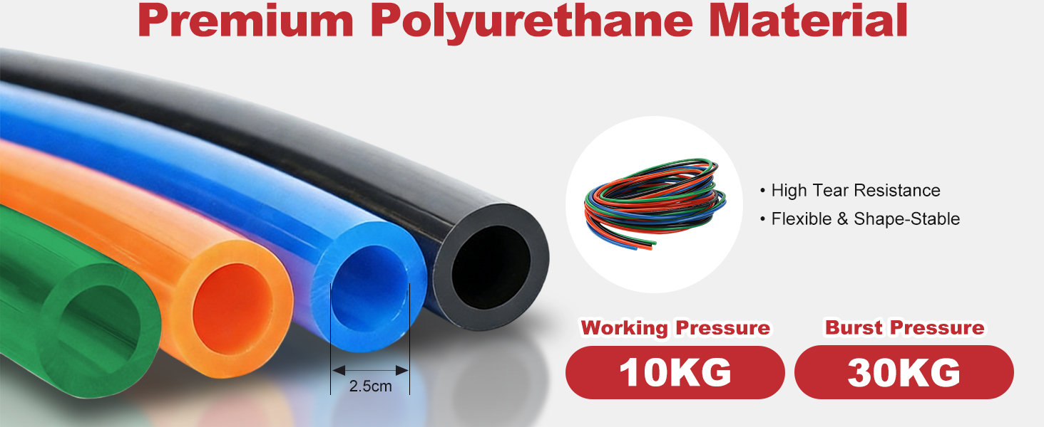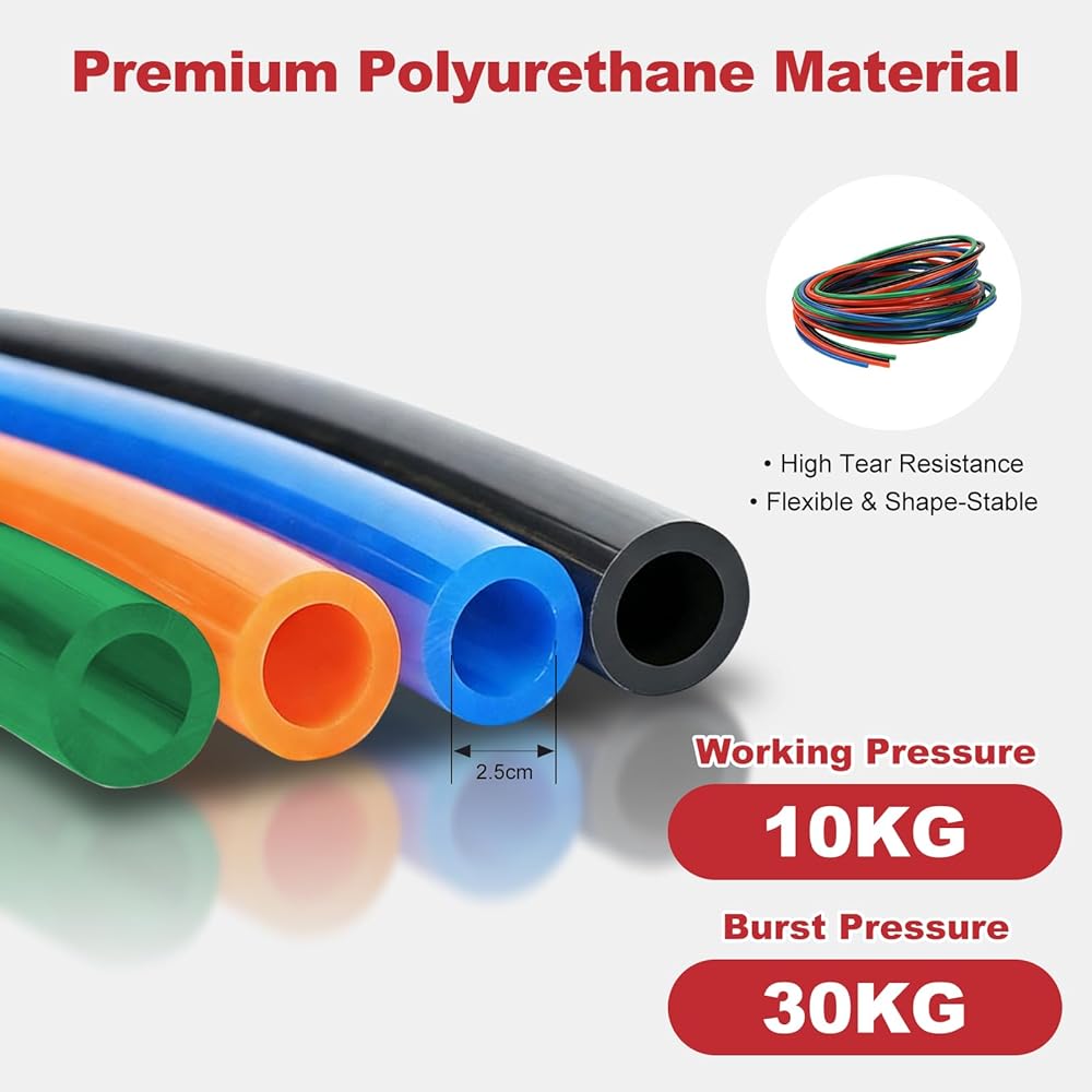 Comprehensive 25-Piece Kit for Air System Updates: This complete set includes 4*high-pressure resistant PU air lines, 6*straight and 3*ninety-degree copper push-in fittings, 12 plastic straps, and a roll of Teflon sealing tape, providing all components needed for a full air line system refresh in one box