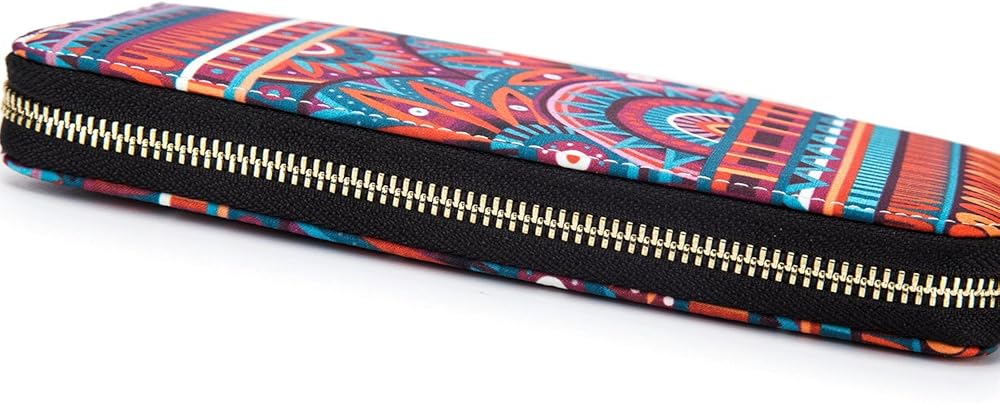 The outer material is a durable Polyester type material. There is plenty of room for cards and cash on the snap side. The zippered side easily holds you mobile phone and there is a zippered change purse in there as well.Really beautiful design an bright colors.Absolutely love love this Bright ,vibrant ,colorful and unique wallet!!!